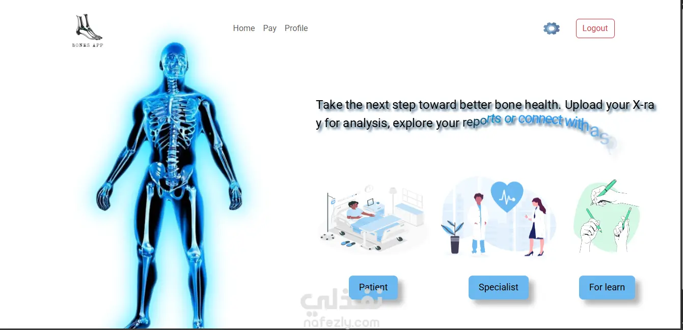 مشروع تخرجي عبارة عن منصة ويب تسمح للمستخدمين برفع صور الأشعة وتحليلها، واستكشاف تقاريرهم الصحية، والتواصل مع أخصائيين لتقديم رعاية شخصية. المنصة مصمّمة لخدمة المرضى والأخصائيين بشكل آمن وفعّال، وتقدّم واجهة سهلة للوصول لنتائج الفحص، إدارة البيانات، وبناء تواصل مباشر بين الأطراف المعنية. يعتمد المشروع على أحدث تقنيات تطوير الويب لتوفير تجربة مستخدم متميّزة وتنظيم سلس للبيانات الطبية.