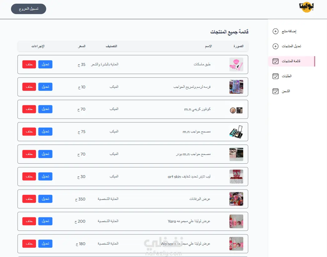 إدارة المنتجات: إنشاء – تعديل – حذف (CRUD).