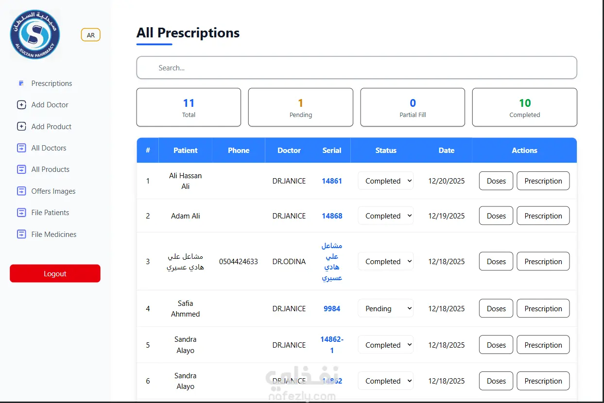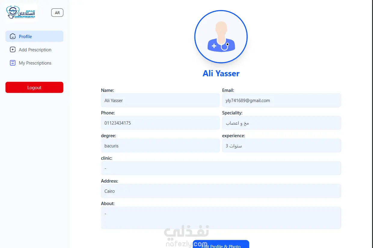 يتضمن النظام واجهة مخصصة للأطباء تتيح لهم عرض بياناتهم، إدارة الوصفات الطبية السابقة، مع إمكانية الإضافة والتعديل والحذف، مما يسهل عملية المتابعة الطبية ويقلل من الأخطاء.