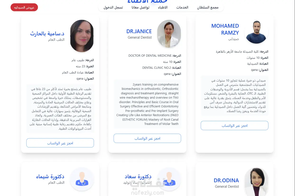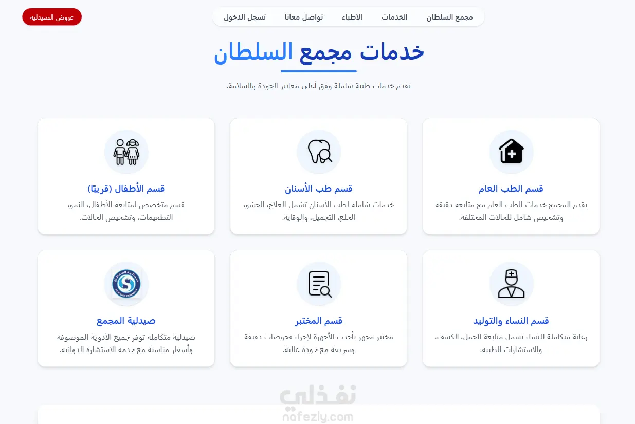 كما يحتوي المشروع على موقع رئيسي للمجمع الطبي موجه للزوار والمرضى، يعرض نبذة عن المجمع، التخصصات الطبية، الأطباء المتاحين، ومنتجات الصيدلية، مما يساعد على تحسين تجربة المستخدم وتعزيز التحول الرقمي داخل المجمعات الطبية.