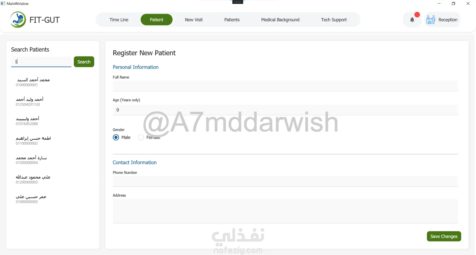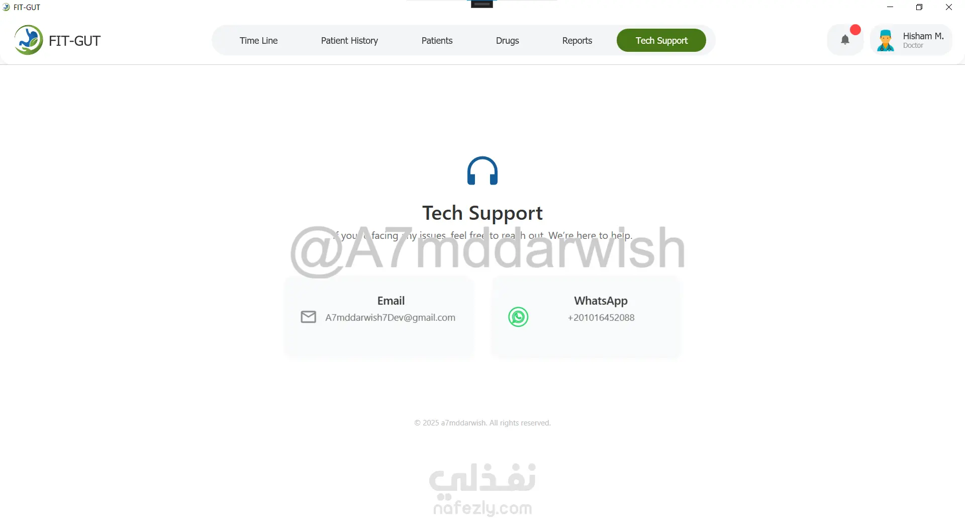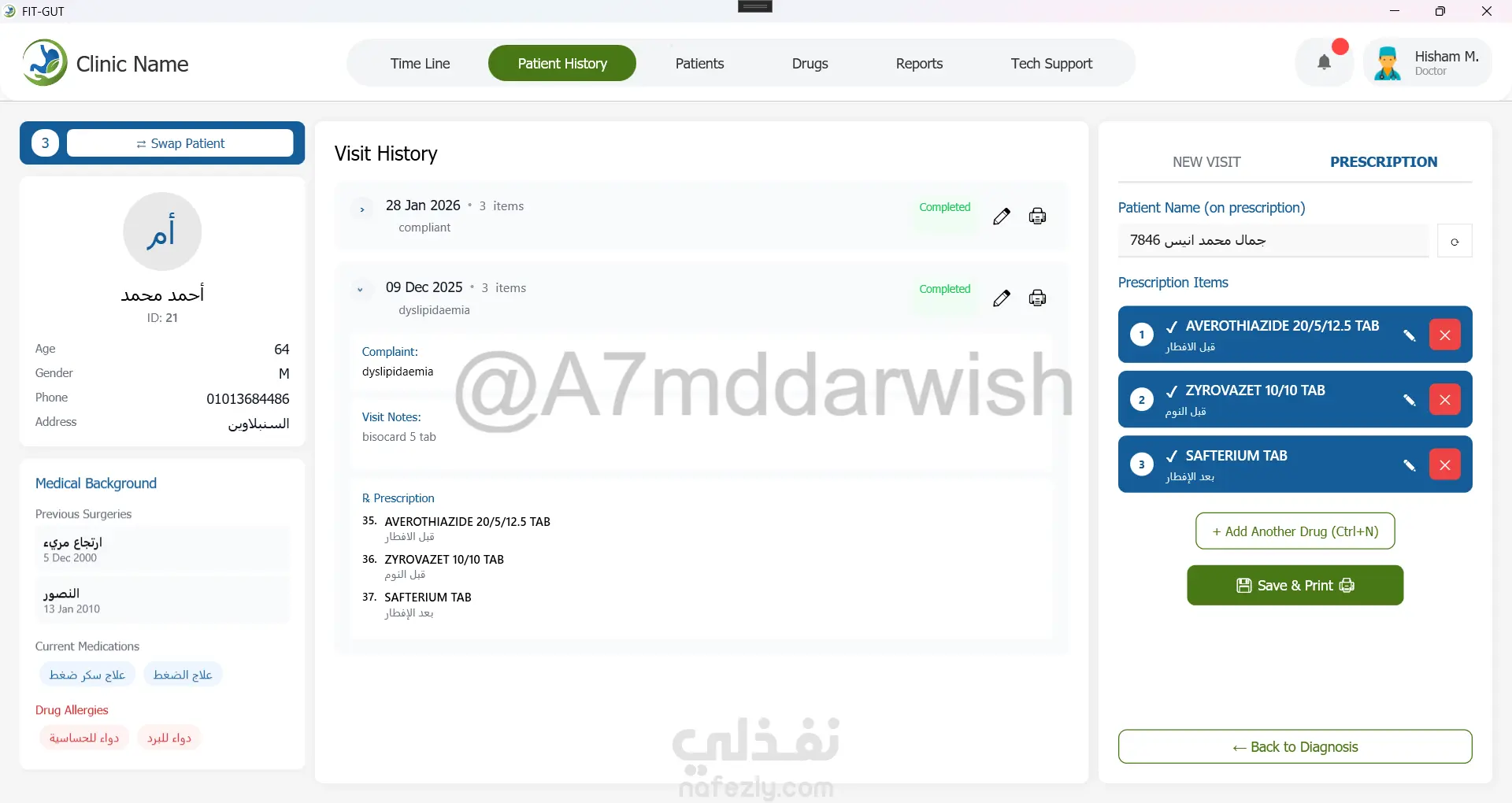 تطبيق سطح مكتب شامل مصمم خصيصاً للعيادات والمنشآت الطبية، مبني بتقنيات حديثة ومعايير عالية لتجربة المستخدم. المميزات الرئيسية: نظام صلاحيات متعدد المستويات للأطباء وموظفي الاستقبال تسجيل وإدارة بيانات المرضى بشكل كامل تتبع دقيق للزيارات الطبية وتسجل المرضي قاعدة بيانات شاملة للأدوية والوصفات الطبية مكتبة متكاملة لتعليمات الاستخدام الدوائي نظام بحث متقدم مع ترقيم تلقائي للصفحات عرض تفصيلي ومنظم لتاريخ المريض الطبي واجهة عصرية وسلسة مع تأثيرات حركية احترافية التحقق التلقائي من صحة البيانات المدخلة مؤشرات تحميل فورية لتحسين تجربة الاستخدام تحديثات لحظية عبر التطبيق نظام تقارير طبية شامل
