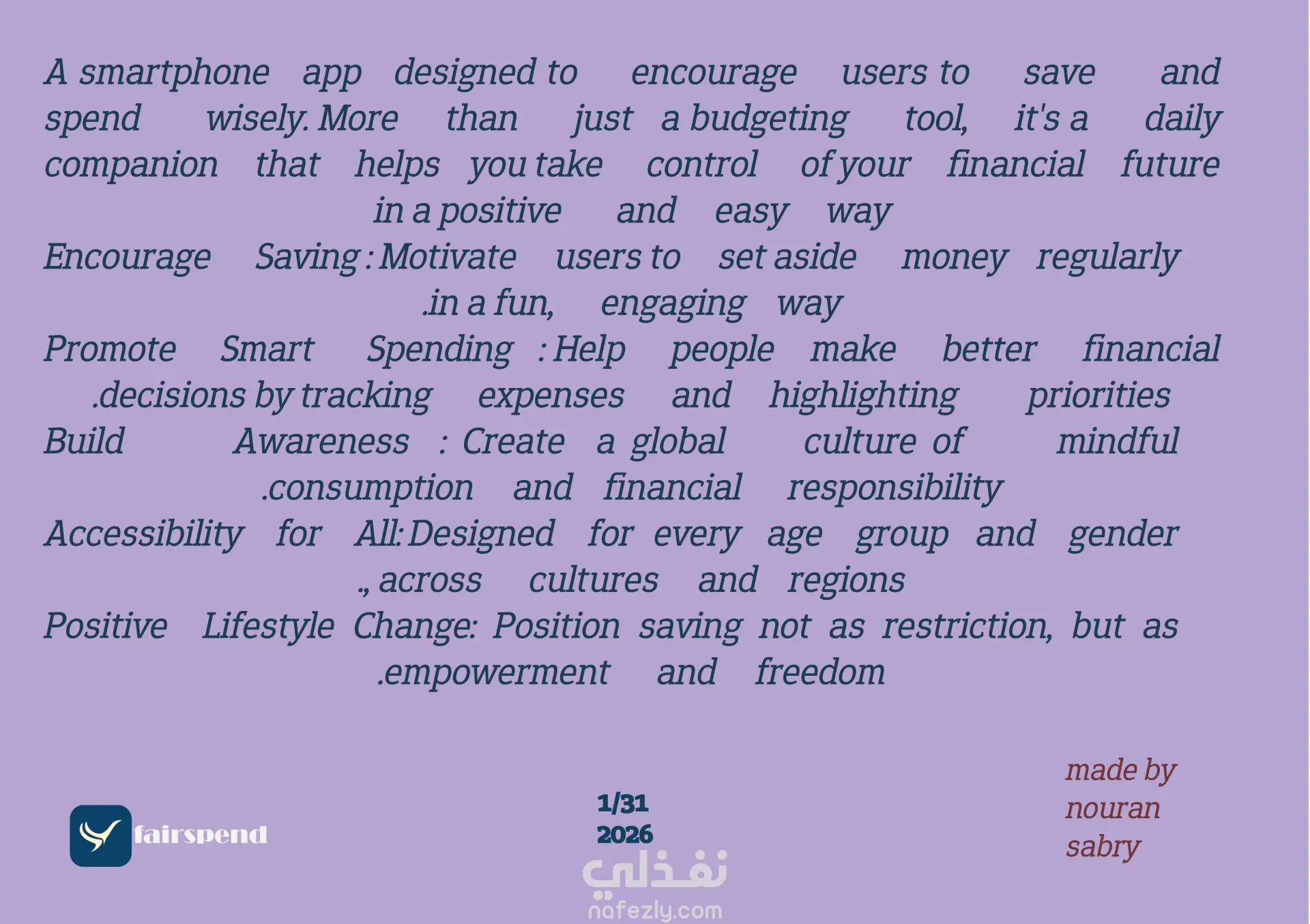 تصميم شعار حديث و رائع fairspend يهدف الشعار الي مساعدة الاخرين علي الادخار و حفظ اموالهم لمستقبل امن و حياه مستقبليه مريحه ، تم الاتفاق علي التصميم بحيث يكون مريح للاخرين لضمان الامان و الثقه بين العملاء لحفظ اموالهم و مستقبلهم مع تطبيق موثوق منه،تم رسم الهويه البصريه و التعبير عنها مثل الطائر كأنها الحريه عندما يتم تأمين الحياه و المستقبل من اغلب المخاطر الممكنه