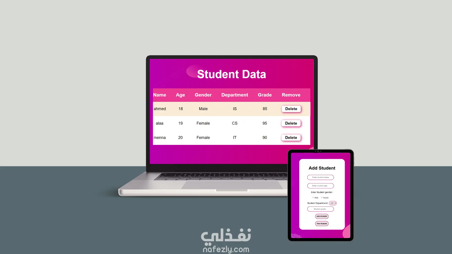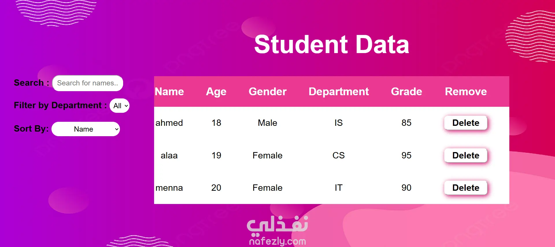 تطبيق ويب قمت بتصميمه وتطويره بالكامل لإدارة بيانات الطلاب بطريقة سهلة ومنظمة. يتضمن التطبيق صفحة تسجيل دخول، صفحة لإضافة بيانات الطلاب، وصفحة لعرض البيانات في جدول تفاعلي. تم تنفيذ واجهة المستخدم مع التركيز على تجربة المستخدم (UI/UX)، إلى جانب برمجة منطق التطبيق باستخدام JavaScript. يوفر النظام خصائص البحث، التصفية حسب القسم، وترتيب البيانات، مما يساعد على إدارة معلومات الطلاب بكفاءة عالية.