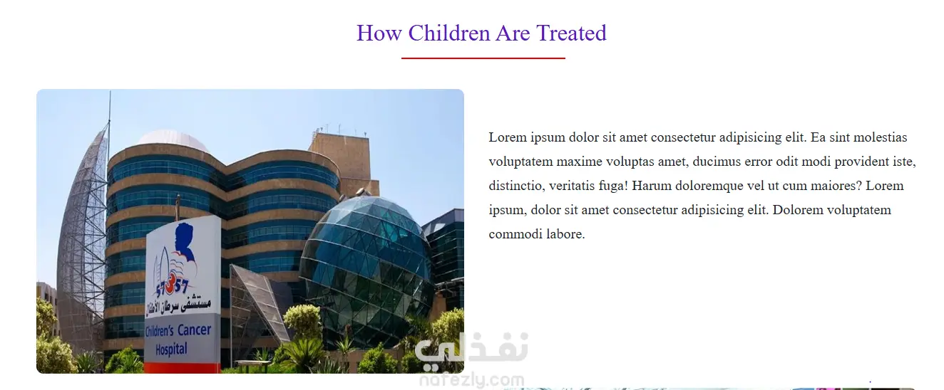 في هذا العمل قمت بتنفيذ الواجهة الامامية لصفحة من صفحات موقع لمستشفي 57357 و في هذا التصميم استخدمت HTML , CSS فقط , ايضا جعلت التصميم متجاوب مع جميع الشاشات , بداية من الشاشات الصغير مثل الموبايل و التابليت الي الشاشات الكبيرة مثل الlaptop و ال PC