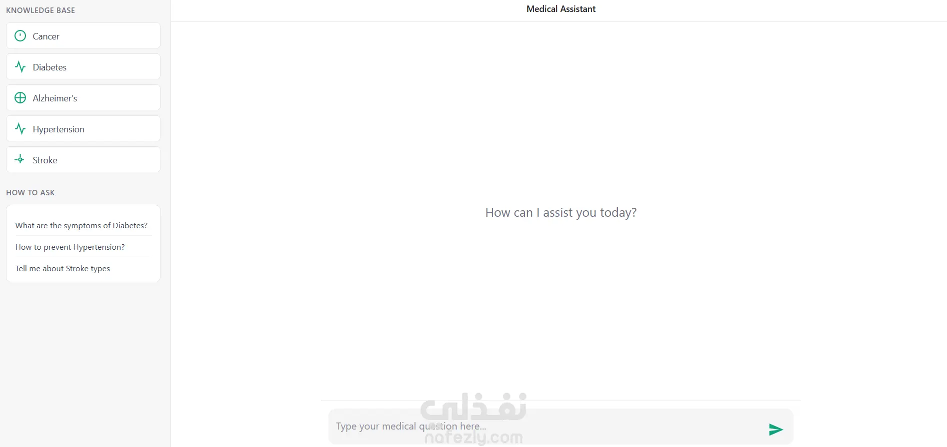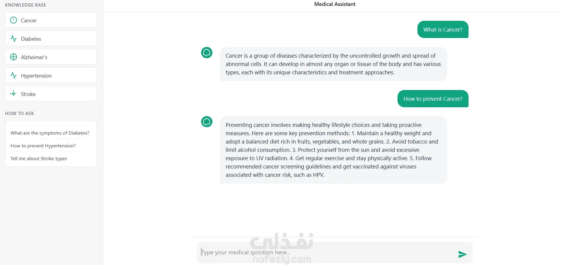 قمت بتطوير شات بوت طبي ذكي كجزء من مشروع مادة معالجة اللغات الطبيعية (NLP). النظام مصمم لفهم أسئلة المستخدم الطبية والإجابة عليها بشكل دقيق باستخدام تقنيات معالجة النصوص والذكاء الاصطناعي. الشات بوت يعتمد على تحليل النص، تصنيف نية السؤال (Intent Classification)، ثم إرجاع الرد المناسب من قاعدة بيانات طبية، ويتم تشغيله من خلال واجهة ويب تفاعلية مبنية باستخدام Flask. المشروع يجمع بين معالجة اللغة الطبيعية، التعلم العميق، ونشر النموذج داخل تطبيق ويب متكامل. 💡 مميزات المشروع معالجة النصوص باستخدام NLTK (Tokenization + Stemming) تحويل النص إلى Bag of Words تصنيف نية السؤال باستخدام نموذج Deep Learning (Keras / TensorFlow) نموذج مدرب مسبقًا على بيانات طبية Backend باستخدام Flask API واجهة ويب تفاعلية دعم لعدة أمراض طبية (السرطان – السكري – الزهايمر – ضغط الدم – السكتة الدماغية) إمكانية ربط الـ API بأي واجهة خارجية تصميم مرن يمكن إعادة تدريبه لأي مجال آخر 🧠 التقنيات المستخدمة Python NLTK TensorFlow / Keras Flask HTML / CSS JSON / Pickle 🏥 المجالات الطبية المدعومة مرض السكري السرطان الزهايمر ارتفاع ضغط الدم السكتة الدماغية ⚙️ آلية عمل النظام المستخدم يكتب سؤال طبي. يتم تقسيم النص ومعالجته باستخدام NLTK. تحويل النص إلى متجه Bag of Words. تمرير البيانات إلى نموذج الشبكة العصبية المدرب. تحديد نوع السؤال (Intent). إرجاع الرد المناسب من قاعدة البيانات الطبية. عرض الرد للمستخدم عبر واجهة الويب.