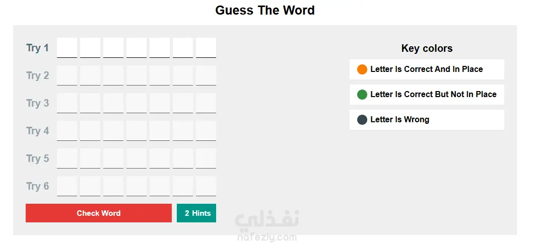 نظام المحاولات: يمتلك اللاعب 6 محاولات (Tries) لتخمين الكلمة الصحيحة.