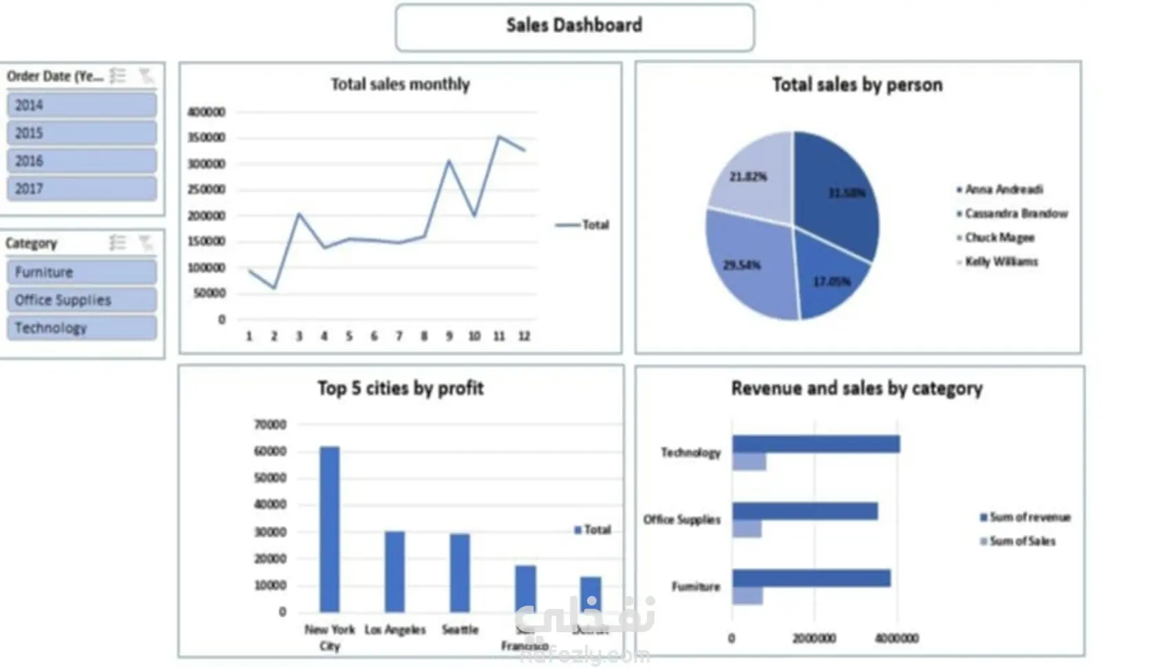 Developed a comprehensive Sales Dashboard to track and analyze monthly revenue trends and salesperson performance. Visualized regional profitability, identifying New York City as the top-performing city with a significant profit margin exceeding 60,000. Analyzed sales distribution by team members using Pie Charts Created category-based revenue comparisons (Technology, Furniture, Office Supplies) using Clustered Bar Charts to monitor product performance against total sales. Implemented interactive Slicers (Order Date & Category) to allow users to filter data dynamically by year (2014-2017) and product type.