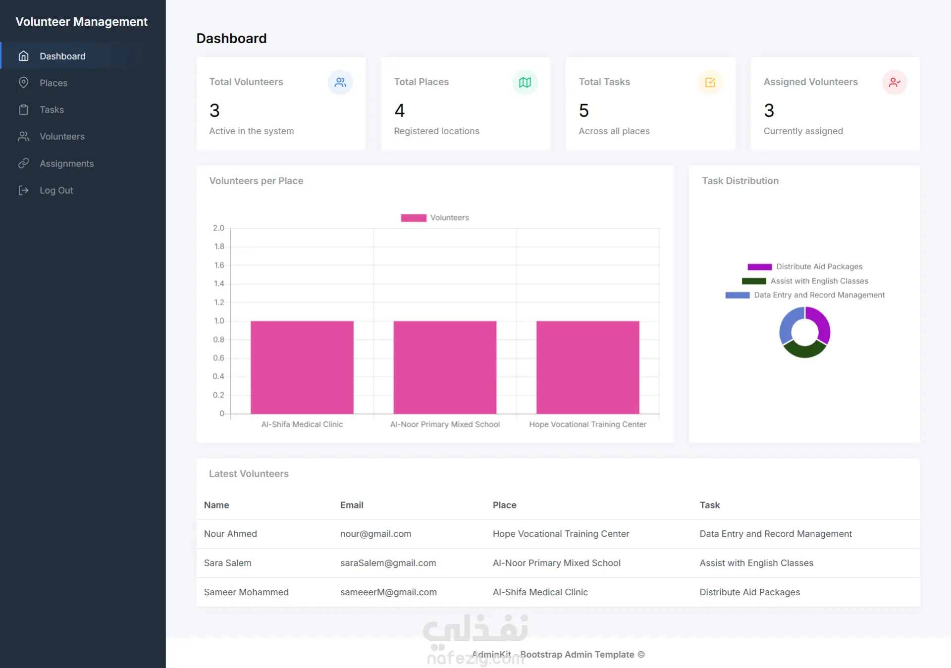 نظام إدارة المتطوعين مُطوّر باستخدام Laravel 10 (واجهة برمجة تطبيقات REST) وMySQL. صُمّم النظام كمنصة أحادية المستخدم (للمسؤول فقط) لإدارة المتطوعين مركزياً، مع واجهة مستخدم حديثة للوحة التحكم مدعومة بـ AdminKit – قالب Bootstrap الإداري ©.