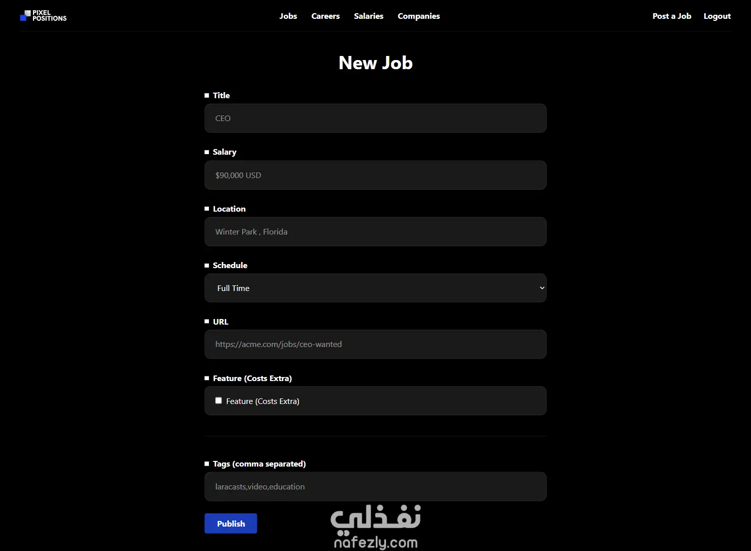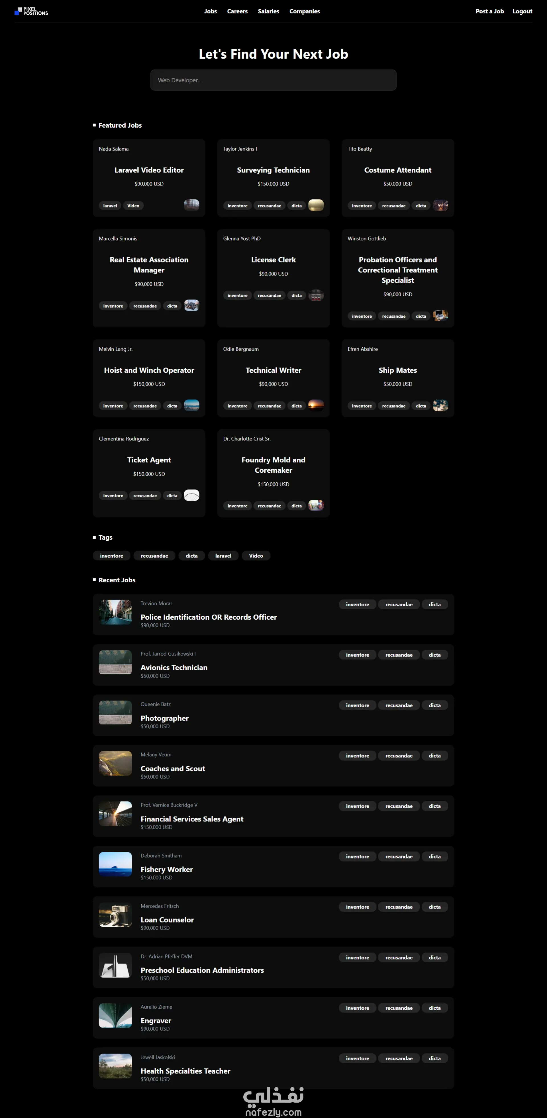 Pixel Positions – تطبيق لوحة وظائف قائم على Laravel يسمح للمستخدمين بإضافة وإدارة قوائم الوظائف، ويدعم التصفية القائمة على Tags، ويتميز بواجهة سهلة الاستخدام.