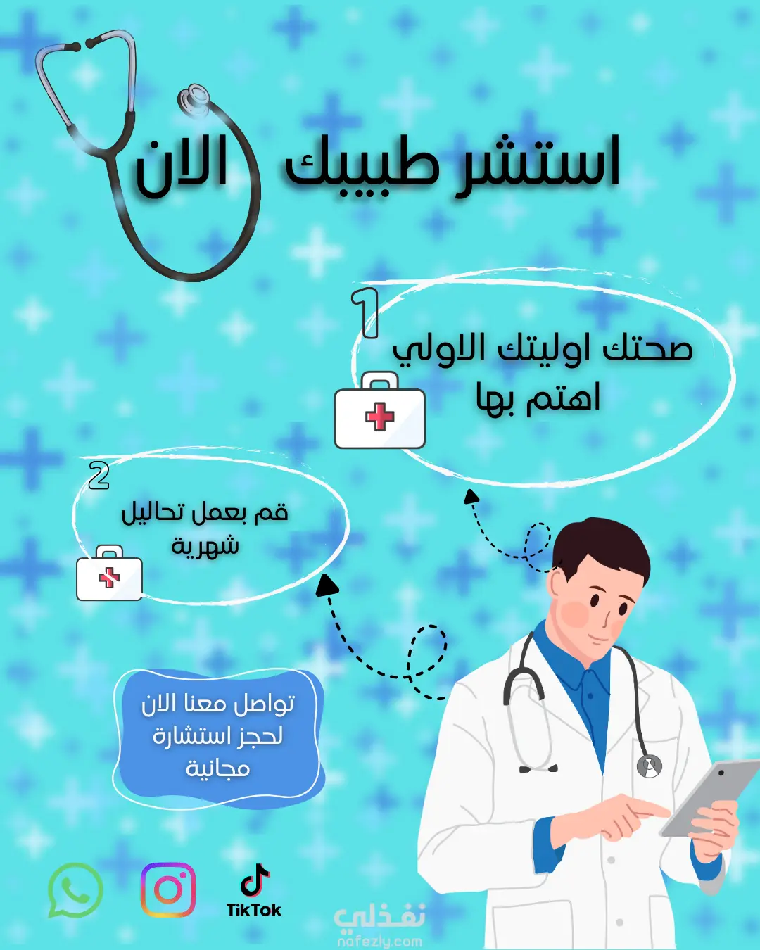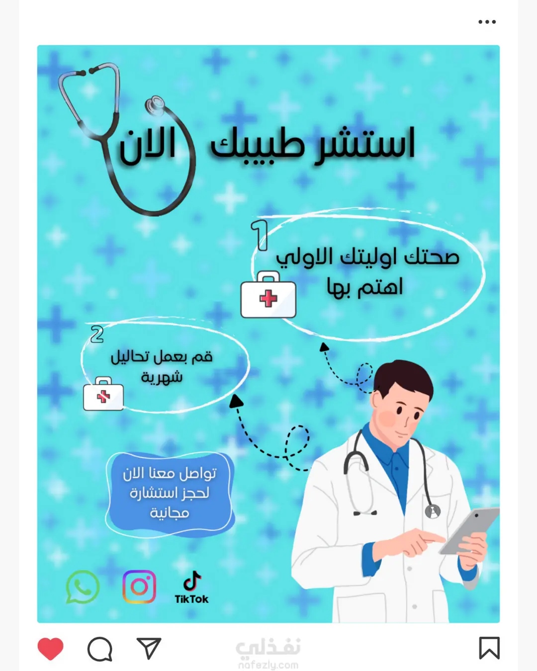 هذا التصميم هوا بوست دعائي إنستاغرام لمستوصف استشارات طبية يهدف إلى توصيل الرسالة بشكل واضح وموثوق، مع الحفاظ على طابع احترافي يعكس المصداقية والراحة النفسية للمرضى.