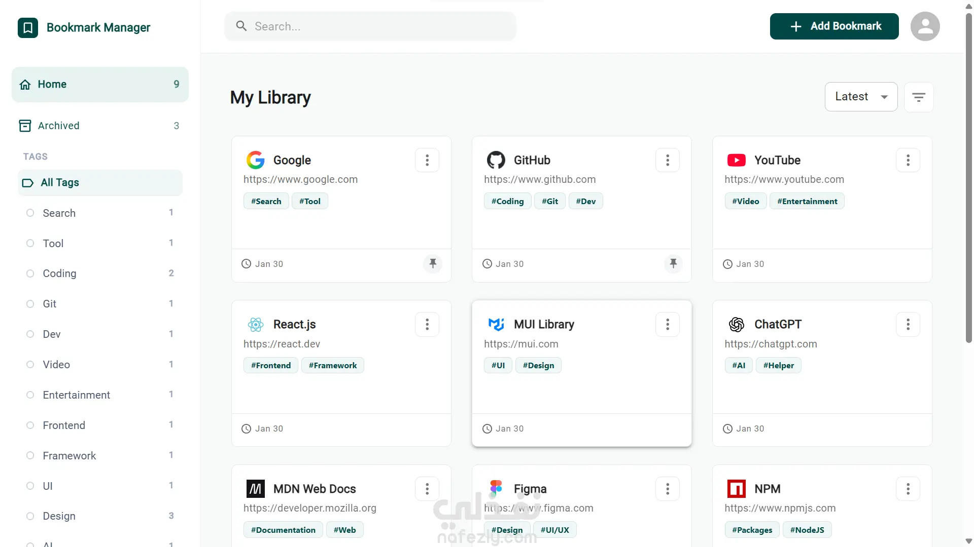 تطبيق ويب لإدارة وحفظ الروابط (Bookmark Manager) تم تطويره باستخدام React.