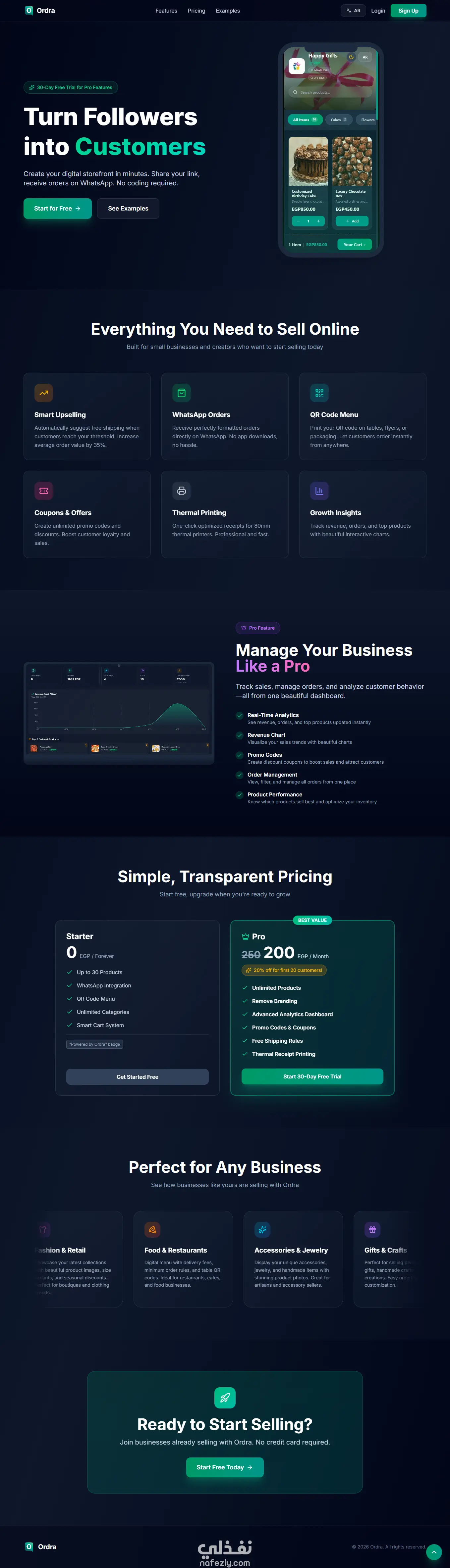 لماذا Ordra؟ (الفكرة والحل) مشروع Ordra هو منصة برمجيات (SaaS) صممت خصيصاً لتمكين البيزنس الصغير (Small Business) و البراندات المحلية (Local Brands) من التحول الرقمي بأقل تكلفة. المنصة تحل مشكلة التعقيد التقني، حيث تتيح لأي تاجر أو صاحب مطعم إنشاء واجهة عرض احترافية واستقبال الطلبات مباشرة على واتساب. حلول متخصصة لقطاعات مختلفة: للكافيهات والمطاعم (Digital Menu): بديل عصري للمنيو الورقي؛ العملاء يمسحون QR Code من على الطاولة لتصفح الوجبات والصور الجذابة. تسريع عملية الطلب وتقليل أخطاء "الكابتن" بفضل الطلب المباشر عبر واتساب بتفاصيل دقيقة. للبراندات المحلية (Fashion & Retail): متجر إلكتروني متكامل يعرض "الكوليكشن" والمقاسات والألوان بوضوح (بدلاً من عشوائية صور إنستجرام). لا يحتاج العميل لتحميل تطبيق؛ المتجر يعمل فوراً على المتصفح. أبرز المميزات التجارية: مولد QR Code تلقائي: كل متجر يحصل على QR Code جاهز للطباعة فوراً (للطاولات، أو لبطاقات التغليف). واجهة مستخدم: تصميم يشبه التطبيقات (App-like Experience) يضمن سهولة التصفح للزبائن. نظام اشتراكات مرن: يدعم الباقات المجانية والمدفوعة (Free vs Pro) لتناسب حجم كل مشروع. هوية بصرية مرنة: إمكانية تخصيص ألوان المتجر لتناسب "لوجو" البراند الخاص بالعميل. التقنيات المستخدمة: تم بناء النظام بمعايير جيدة لضمان السرعة وعدم التوقف وقت الذروة: Backend: Laravel 12 (API) Frontend: React 19 (SPA) Database: MySQL & Redis رابط المشروع: https://www.ordras.app/