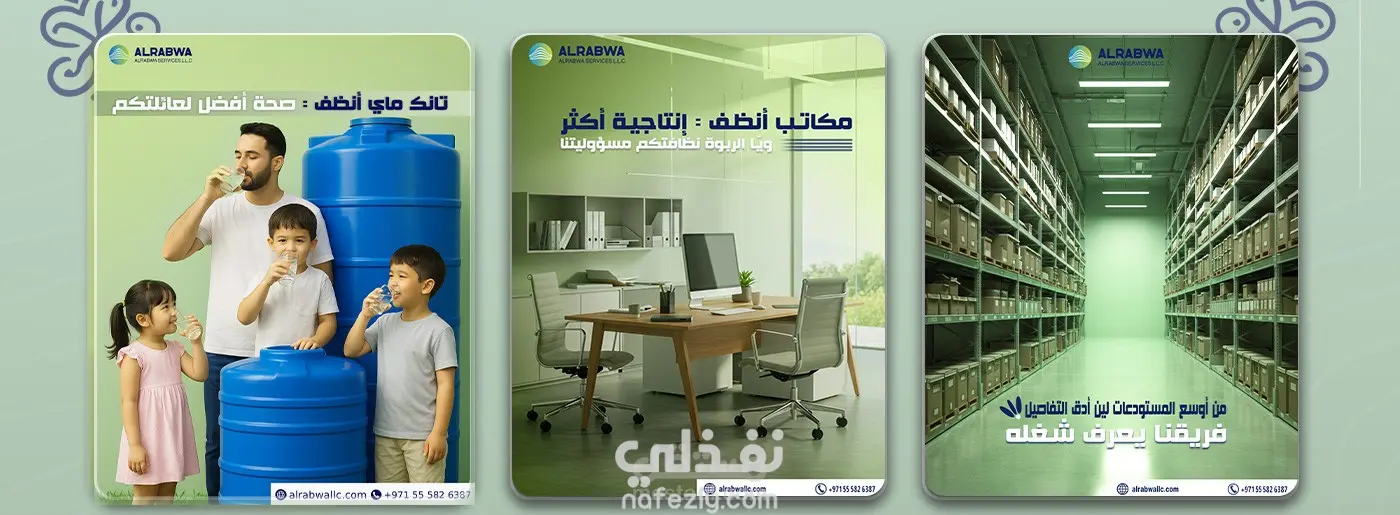 تم تنفيذ خطة تسويقية متكاملة لشركة الربوة، وهي شركة متخصصة في خدمات التنظيف ومكافحة الحشرات داخل أبوظبي، تشمل تنظيف المنازل، المكاتب، المستودعات، التانكات، السجاد، الرخام، النجف، والستائر، بالإضافة لخدمات التعقيم ومكافحة الحشرات.