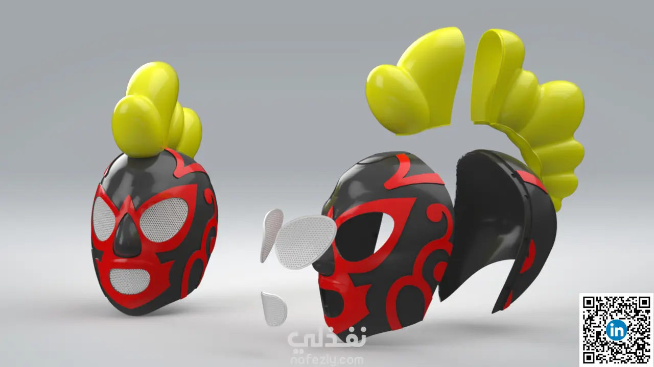 تصميم قناع ثلاثي الأبعاد تم تصميمه للطباعة ثلاثية الأبعاد. باستخدام SolidWorks – Surface Modeling لإنشاء أشكال عضوية ناعمة وسماكات مناسبة للتصنيع. التصميم مكوّن من عدة أجزاء منفصلة (Exploded View) لسهولة الطباعة والتجميع، ويشمل: هيكل القناع الرئيسي بتفاصيل زخرفية مدمجة عناصر علوية عضوية الشكل شبكات تنفس/رؤية مصممة للطباعة بدون دعامات معقدة تقسيم ذكي للأجزاء لتقليل التشوه وتحسين جودة السطح بعد الطباعة تمت مراعاة: سماكات مناسبة للطباعة (3D Print Friendly) إمكانية التجميع بعد الطباعة تقليل الـ Overhangs