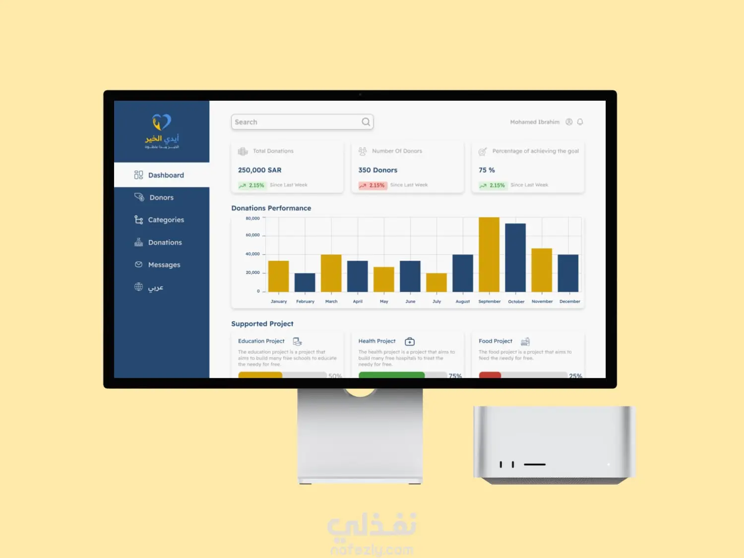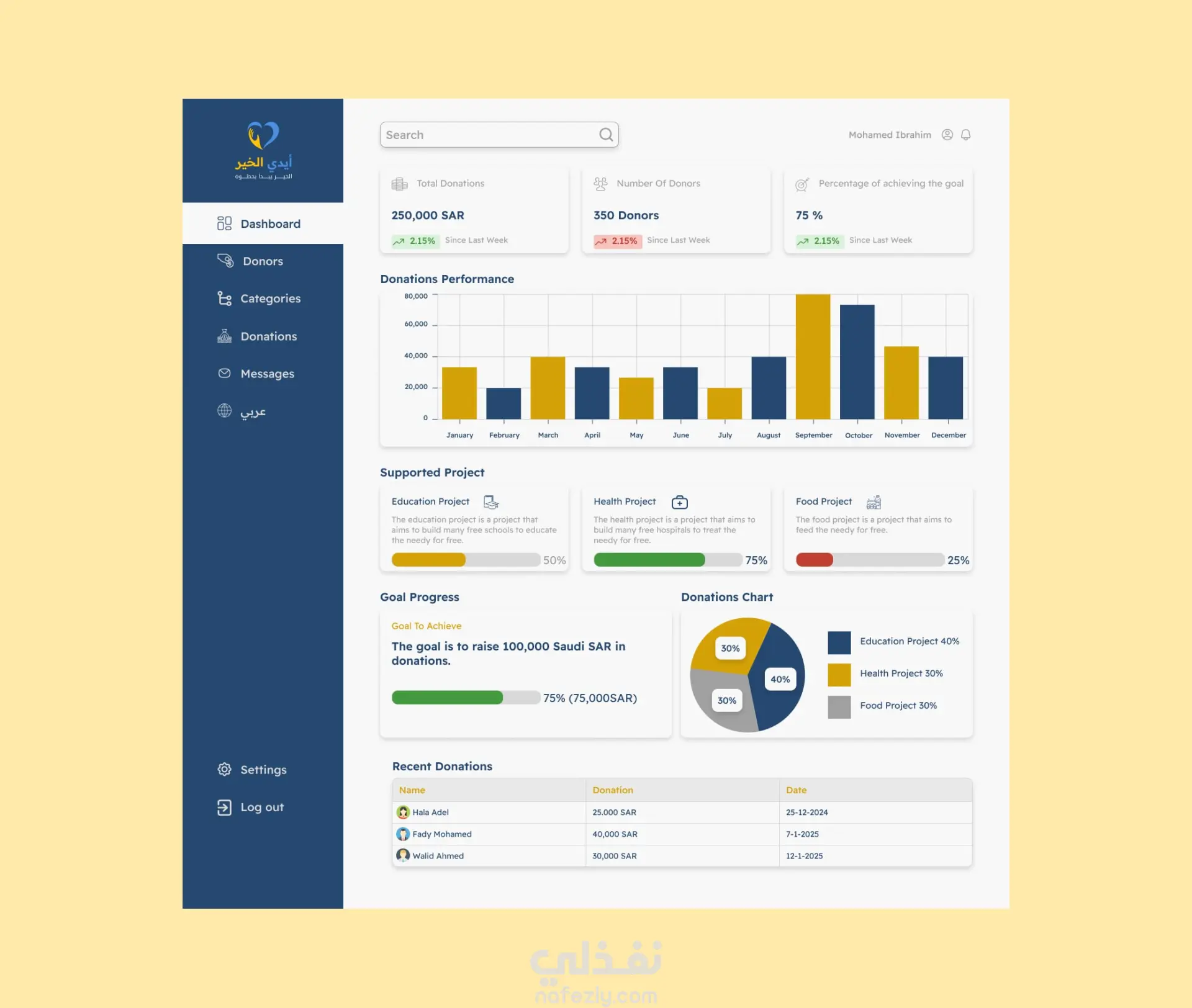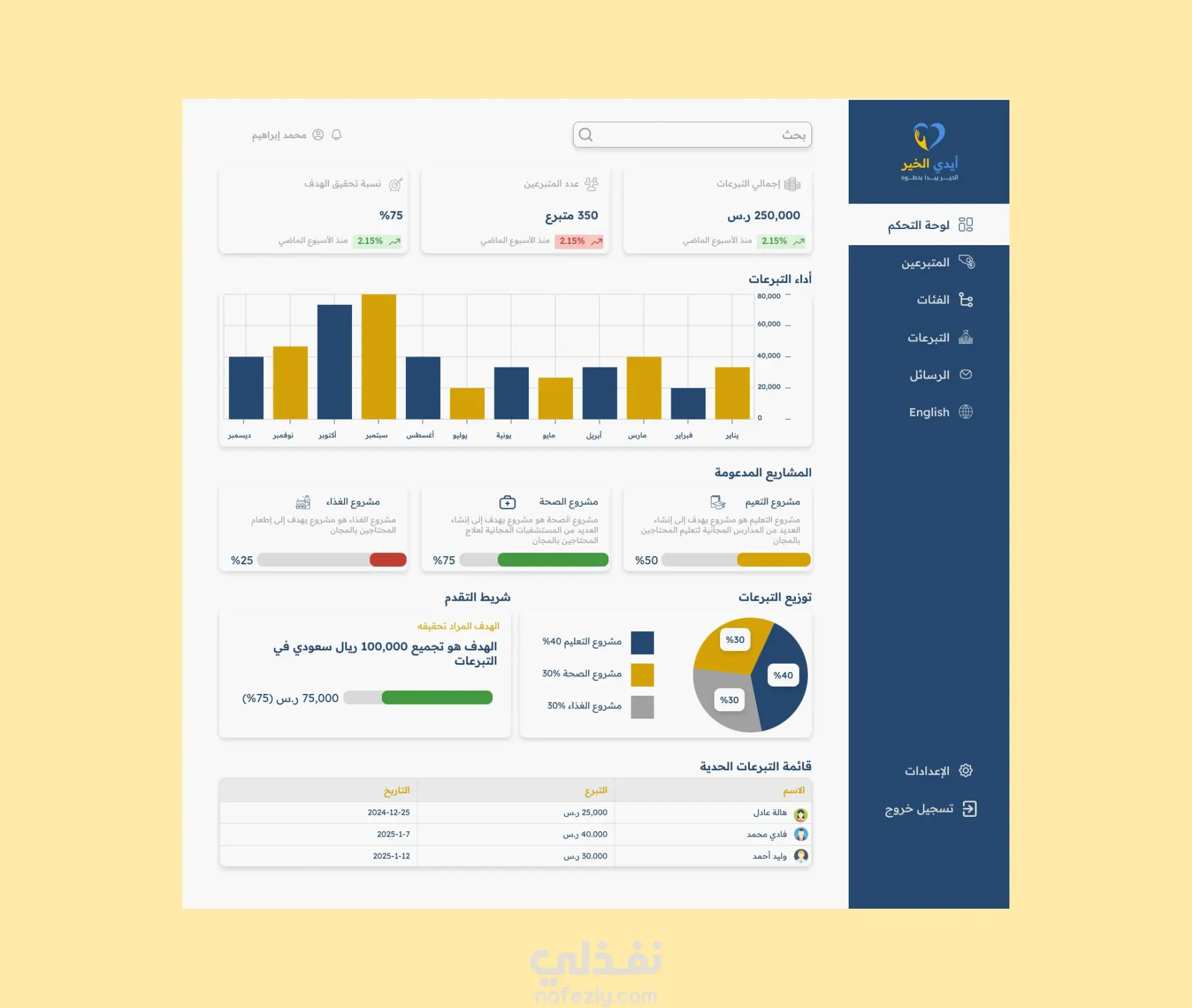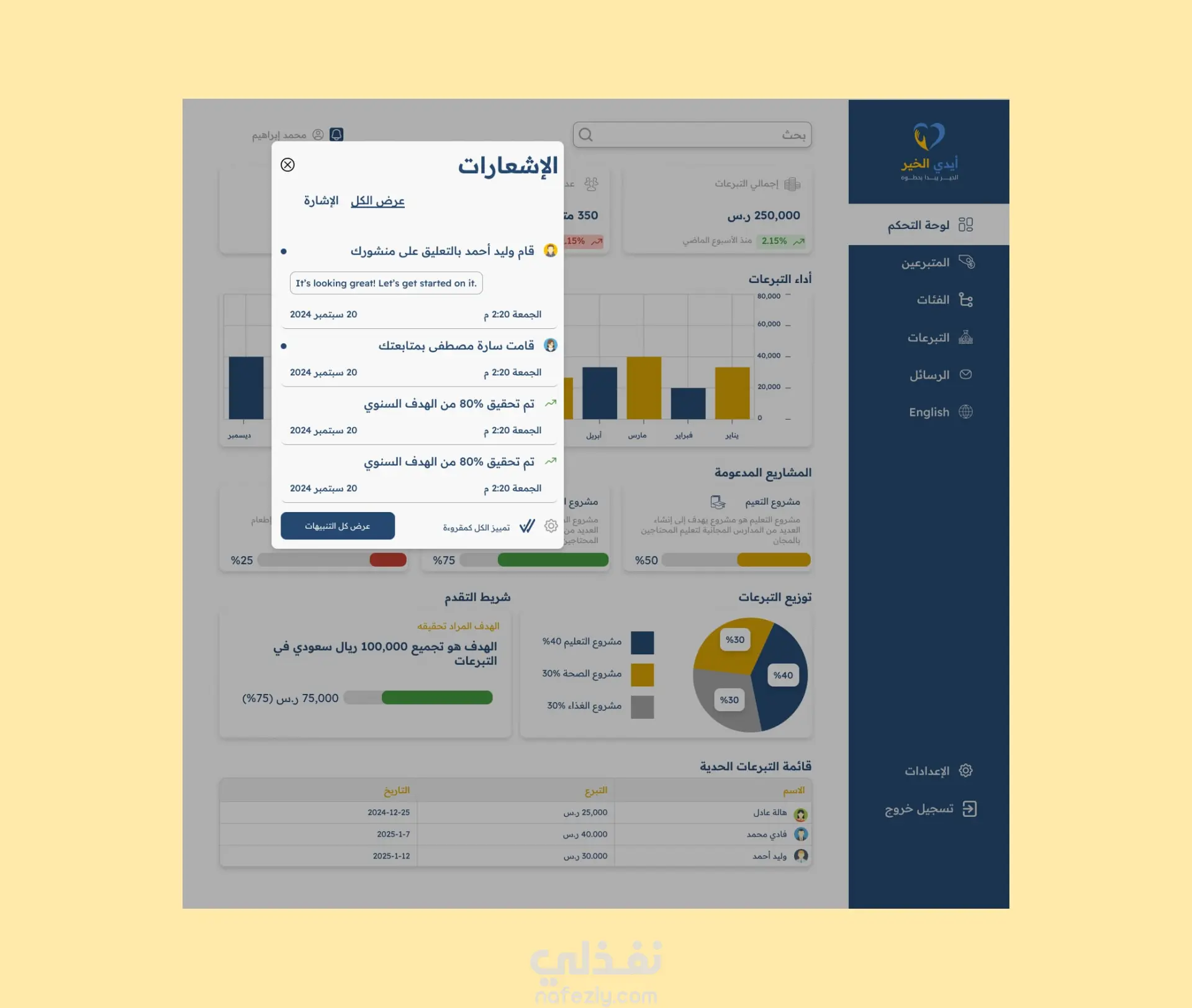 مشروع لوحة تحكم ايدي الخير لجمع تبرعات لعمل الخير مع توضيح جزء الاشعارات و هي باللغتين العربية و الانجليزية