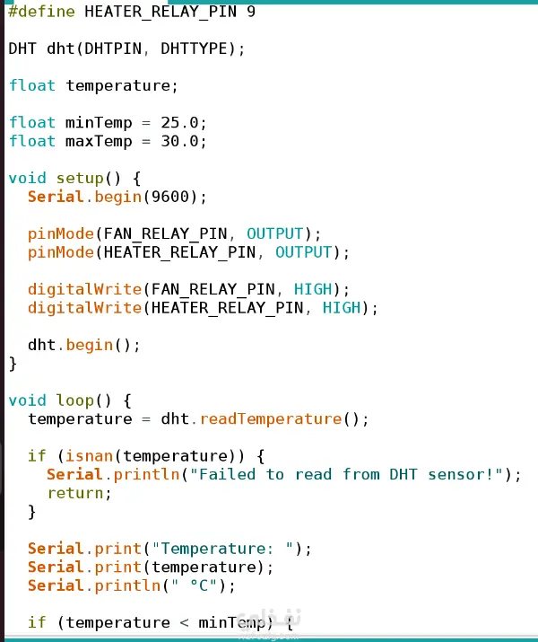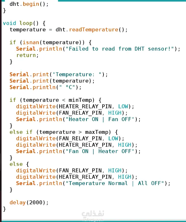 مشروع يهدف إلى تصميم وتنفيذ نظام ذكي لإدارة مزرعة دواجن يعتمد على إنترنت الأشياء، بهدف تحسين الظروف البيئية داخل المزرعة وزيادة كفاءة التشغيل وتقليل التدخل البشري. يقوم النظام بمراقبة درجة الحرارة والرطوبة داخل المزرعة والتحكم في أنظمة التدفئة والتهوية والتغذية بشكل يدوي وتلقائي كنت مسؤولًا عن برمجة وقراءة بيانات درجة الحرارة والرطوبة باستخدام حساس DHT، وتحليل القيم المقروءة لتطبيق منطق تحكم يقوم بـ تشغيل وإيقاف نظام التدفئة تلقائيًا عند الوصول إلى درجات حرارة محددة، وذلك لضمان توفير بيئة مناسبة للدواجن. تم التركيز على استقرار القراءات ودقة التحكم باستخدام Arduino IDE والمكتبات الخاصة بالحساس