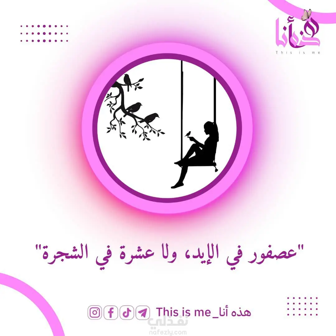 يعتمد هذا التصميم على البساطة الجمالية وفكرة الربط المباشر بين الصورة والكلمة. من خلال استخدام أسلوب (الظلال) السوداء داخل إطار أرجواني هادئ، استطاعت أن تجسد المقولة المأثورة بشكل بصري جذاب. التوزيع المنظم للعناصر، مع الحفاظ على مساحات بيضاء مريحة للعين، يعكس احترافية في إيصال المعنى بلمسة إبداعية رقيقة تعبّر عن الهوية