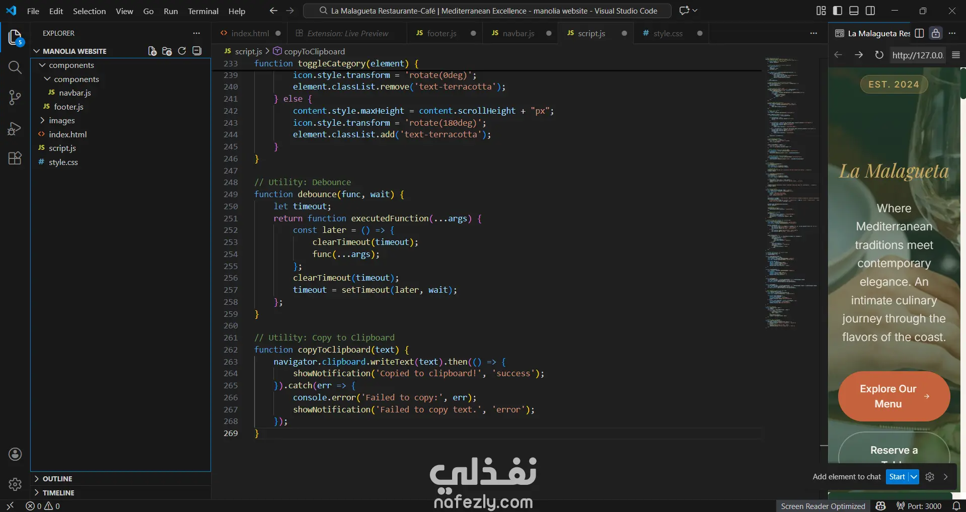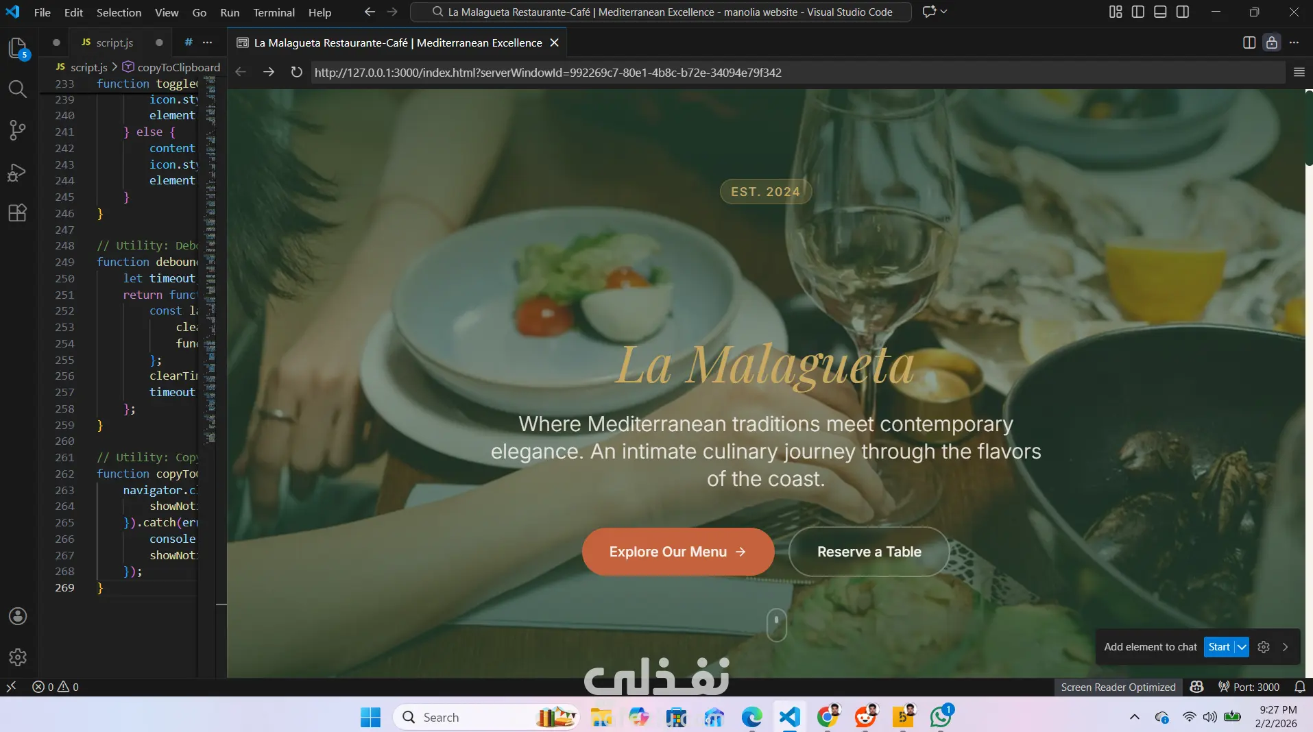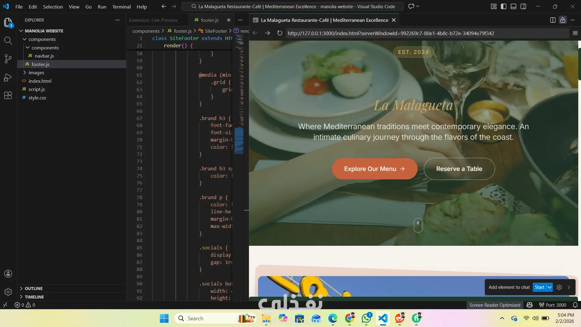 صممت هذا الموقع الإلكتروني لمطعم بطريقة عصرية واحترافية باستخدام HTML وCSS وJavaScript، مع واجهة مستخدم جذابة تجعل الزائر يشعر بالراحة عند التصفح. الموقع يتميز بـ: تصميم متجاوب يعمل بكفاءة على جميع الأجهزة (كمبيوتر، تابلت، موبايل). عرض قائمة الطعام بطريقة منظمة وسهلة القراءة. إمكانية الحجز والتواصل مع المطعم بشكل مباشر. تجربة مستخدم سلسة مع لمسات تفاعلية تضيف حيوية للموقع. الهدف من هذا المشروع كان خلق موقع يعكس هوية المطعم ويجذب الزبائن بطريقة احترافية وعصرية.
