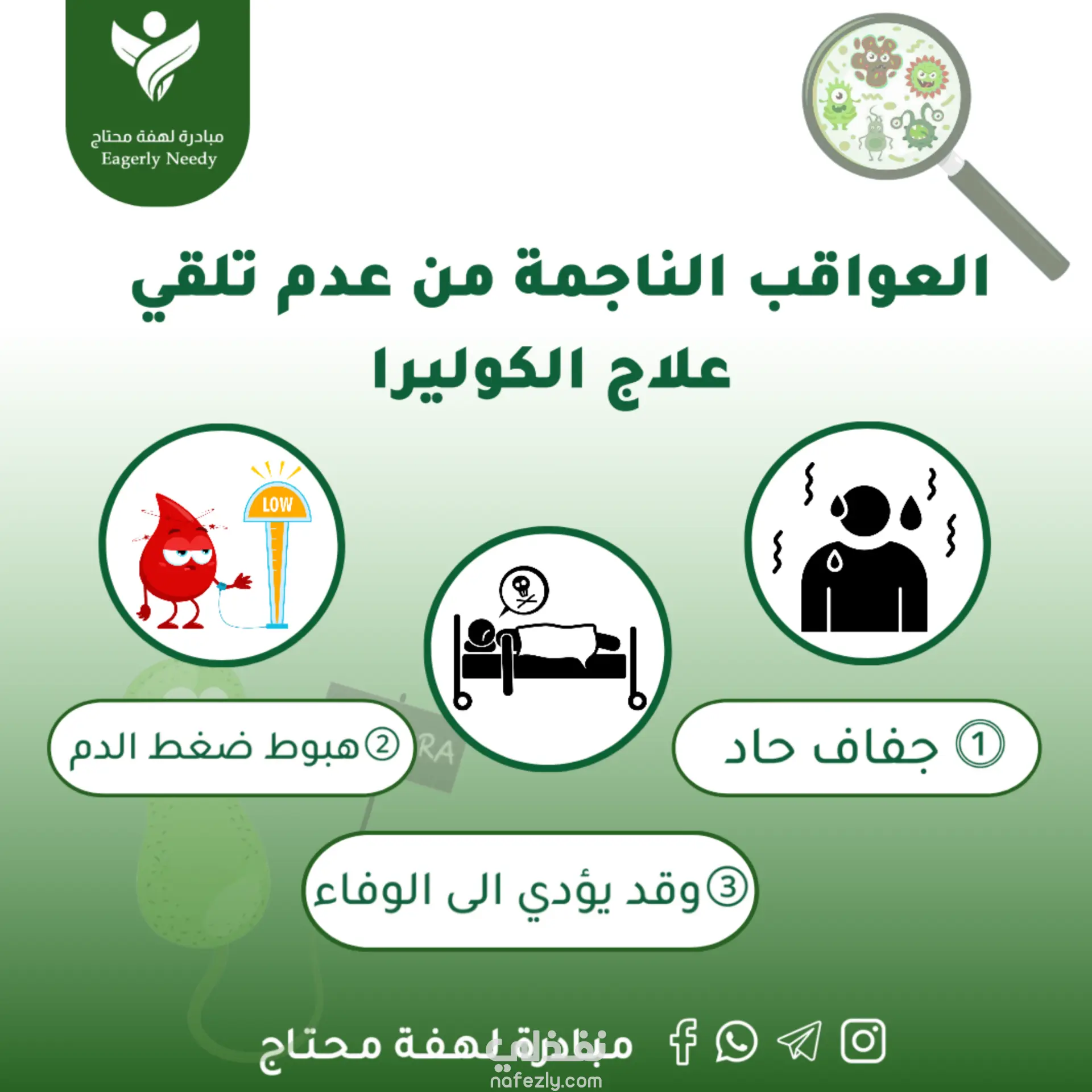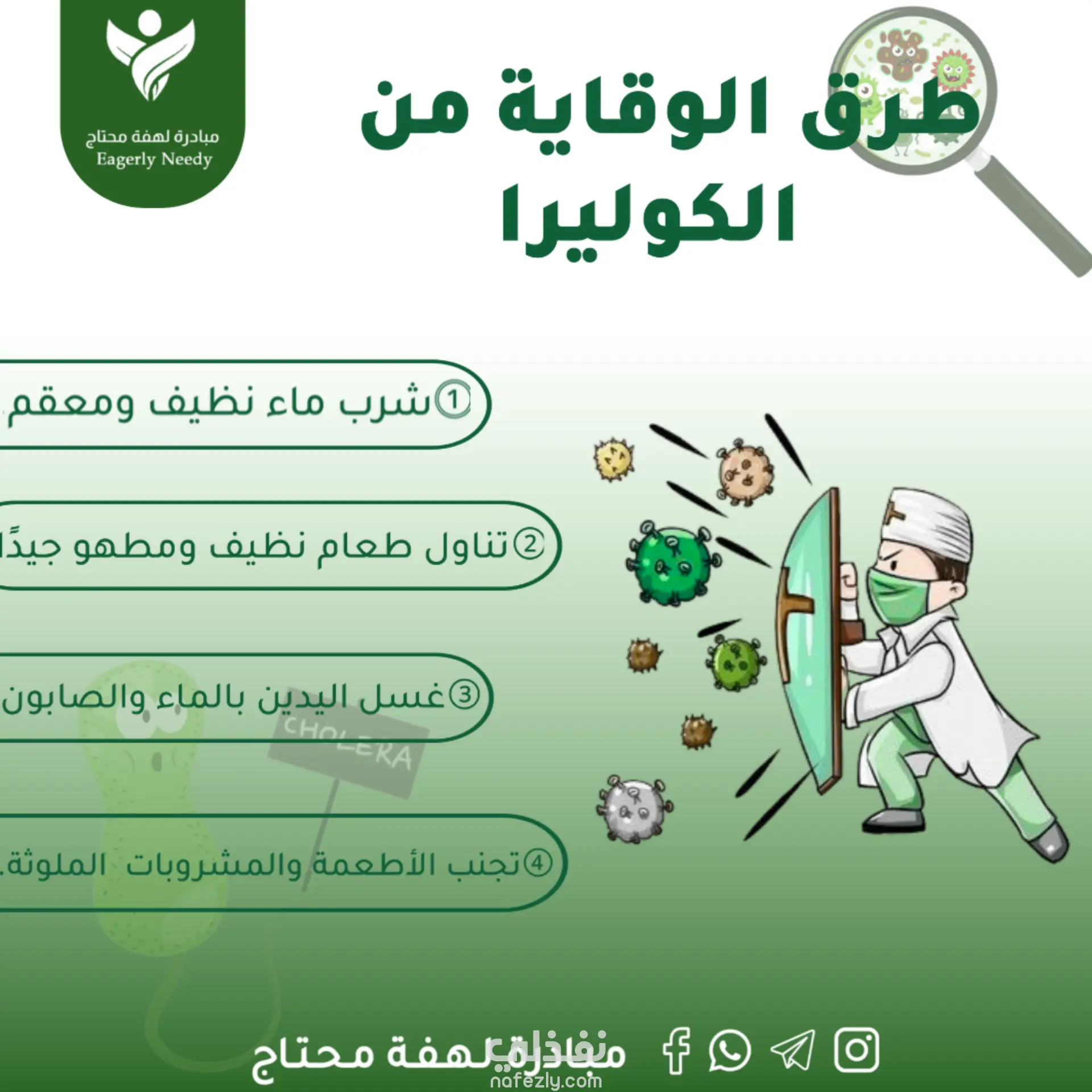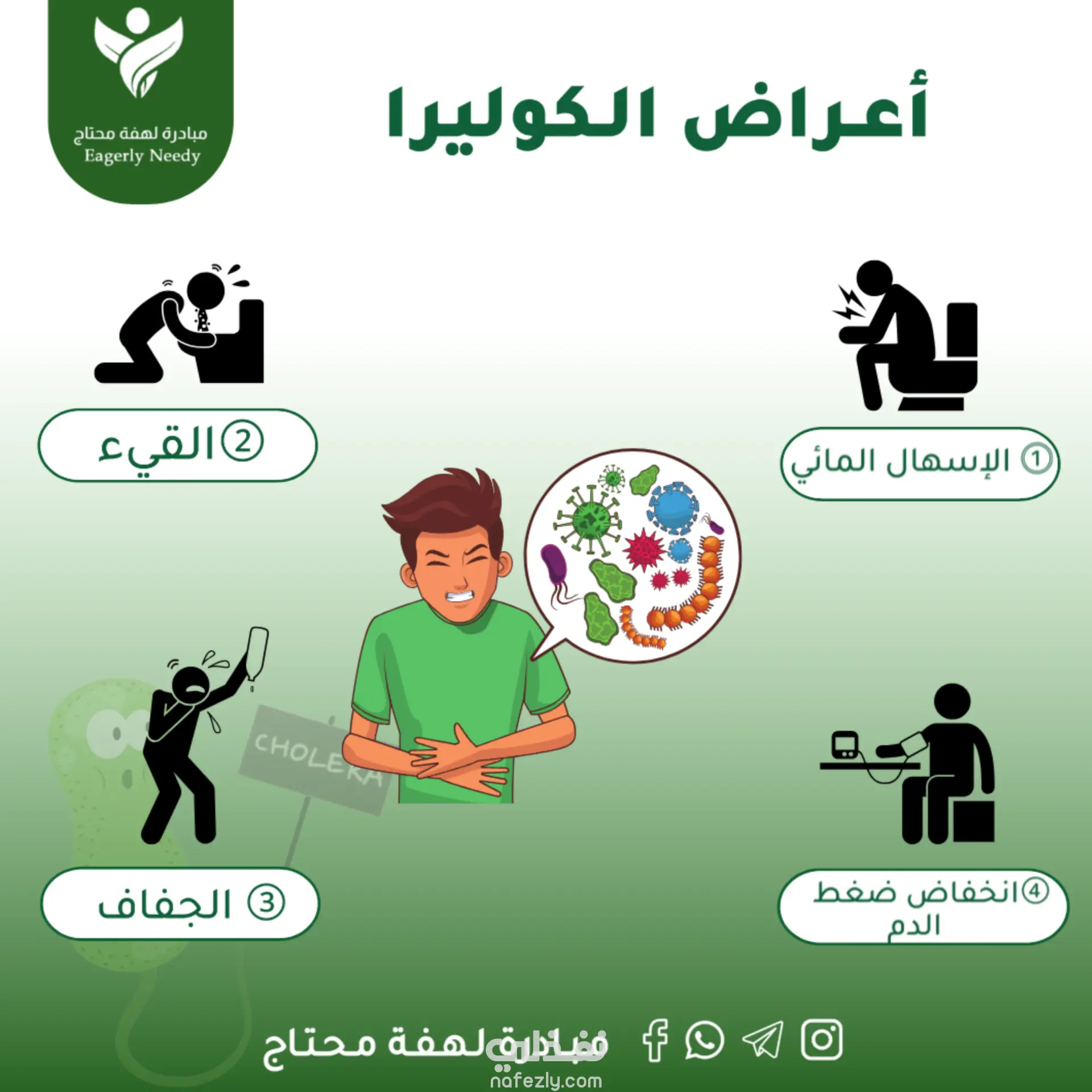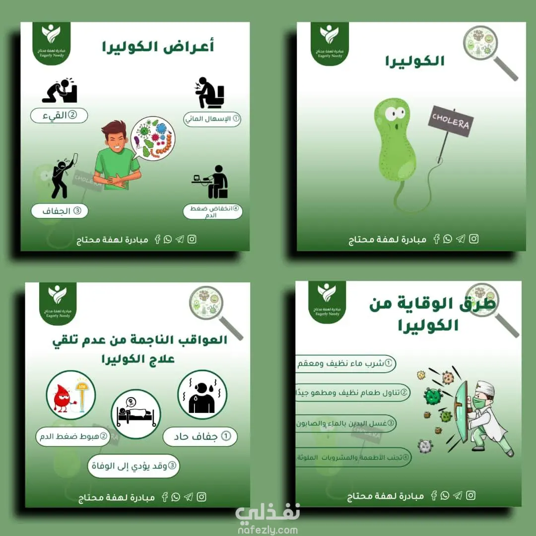 اتبعت في هذا التصميم منهج التوعية البصرية المباشرة من خلال استخدام الرسوم التوضيحية (Infographics) لتبسيط المعلومات الطبية المعقدة حول الكوليرا. تقسيم المعلومات إلى أربعة تصميمات مستقلة على تنظيم المحتوى وسهولة استيعابه من قبل المتلقي.