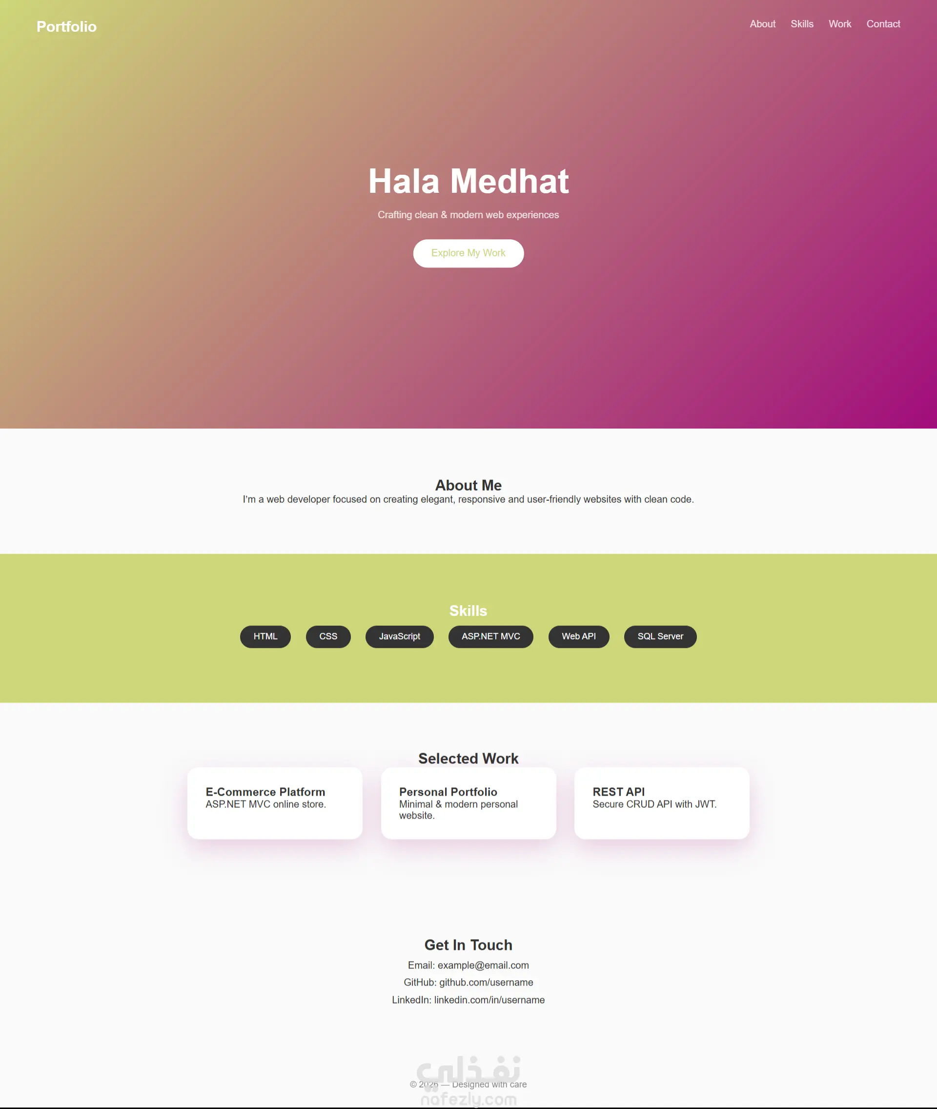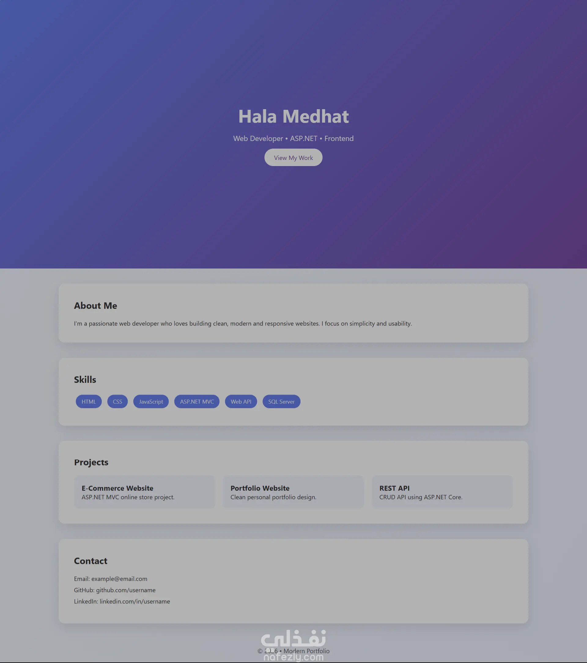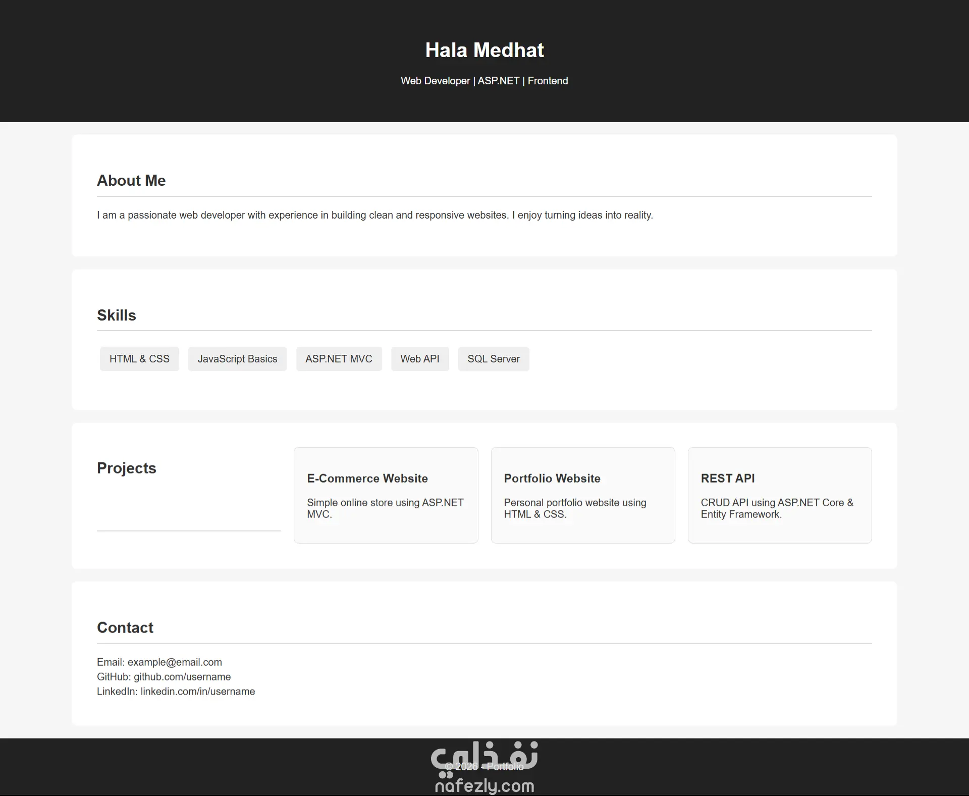 - تصميم صفحة Portfolio بسيطة واحترافية - صفحة نبذة شخصية (About Me) - عرض المهارات بشكل منظم - عرض المشاريع مع صور ووصف - قسم للتواصل (Contact) - تصميم متجاوب مع الموبايل والكمبيوتر - كود نظيف وسهل التعديل
