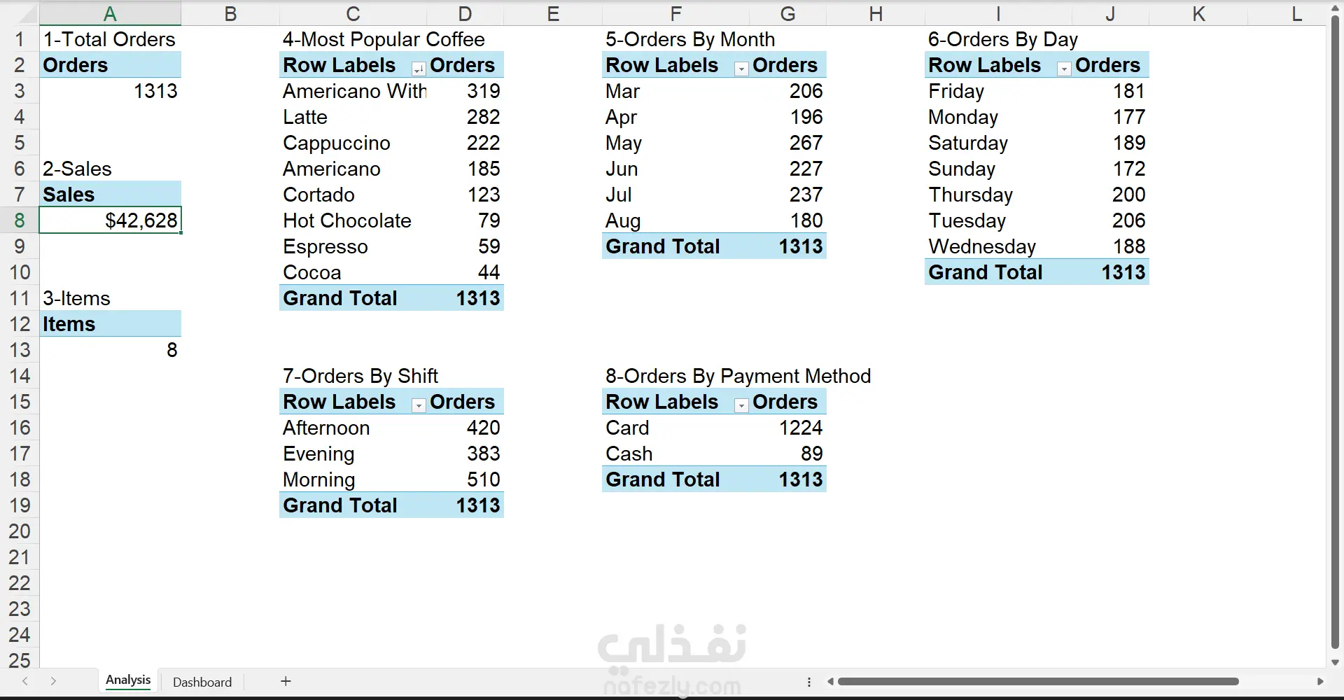 نوع العمل: تحليل بيانات وتصميم داشبورد تفاعلي باستخدام Microsoft Excel. وصف المشروع: قمت بتحليل بيانات مبيعات محل قهوة وبناء داشبورد تفاعلي يساعد صاحب المشروع على متابعة أداء المبيعات وفهم سلوك العملاء. يوضح الداشبورد المبيعات اليومية، المنتجات الأكثر طلبًا، وأوقات الذروة، مما يساعد في اتخاذ قرارات أفضل لإدارة النشاط. ما تم تنفيذه: تنظيف وتجهيز البيانات باستخدام Power Query، تنظيم وتحويل البيانات لتكون جاهزة للتحليل ،تحليل إجمالي المبيعات وعدد الطلبات، تحديد المنتجات الأكثر مبيعًا، مقارنة المبيعات حسب الأيام وفترات العمل (Shifts)، تحليل طرق الدفع وتفضيلات العملاء. مميزات المشروع: - داشبورد تفاعلي وسهل الاستخدام. - تحديث تلقائي للبيانات باستخدام Power Query. - تم اضافه Slicer حتى تسمح ب فلتره البيانات والوصول للمعلومات المطلوبه. - عرض البيانات بشكل واضح باستخدام الرسوم البيانية. - مناسب لأصحاب المشاريع الصغيرة والمتوسطة. طريقة التنفيذ: تم استخدام Power Query لتنظيف وتحويل البيانات، ثم إنشاء Pivot Tables و Pivot Charts لعرض التحليلات في داشبورد ديناميكي قابل للتحديث
