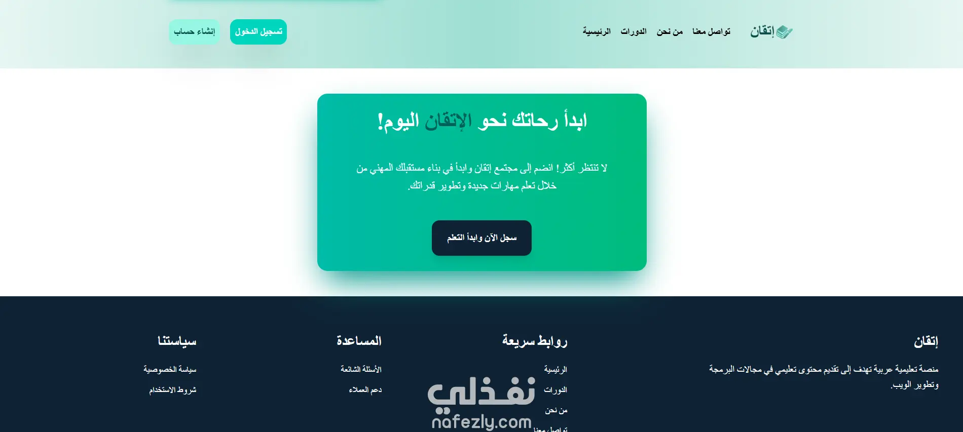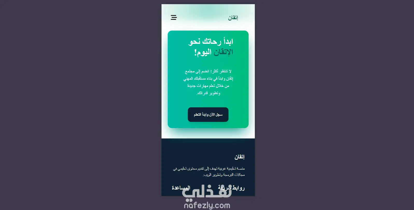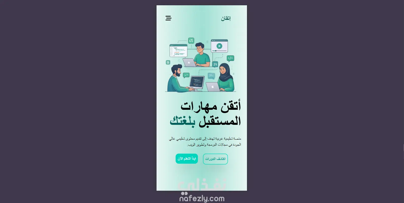 إتقان هو Landing Page تعليمية عربية تهدف إلى تقديم رؤية واضحة لمنصة تعلم إلكتروني موجهة للطلاب والمتعلمين ذاتيًا. تم تصميم الصفحة لعرض فكرة المنصة، مميزاتها، وأهدافها بشكل مبسط وجذاب، مع التركيز على تجربة مستخدم حديثة وسهلة.