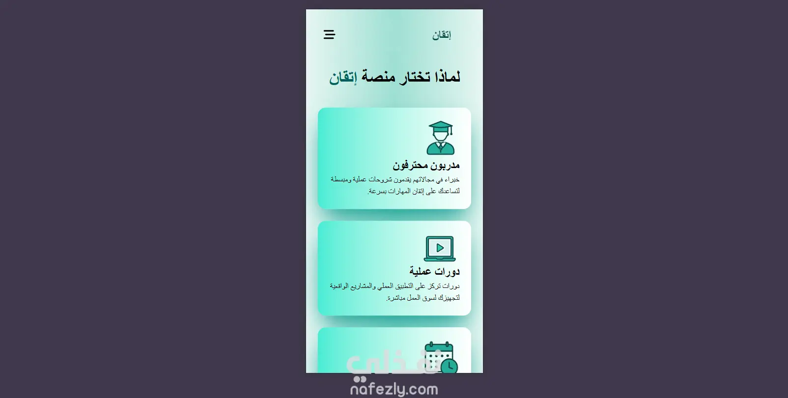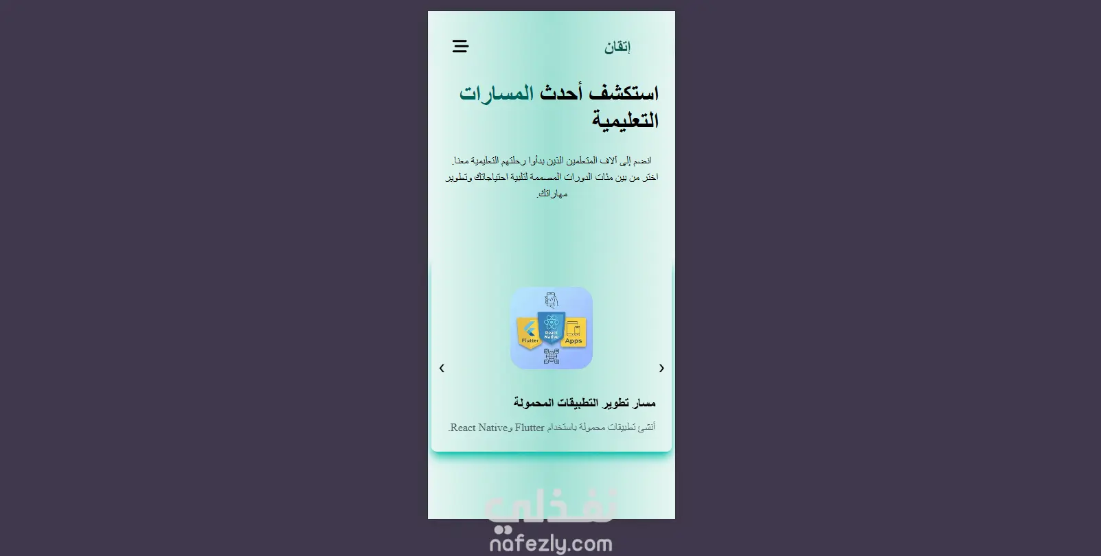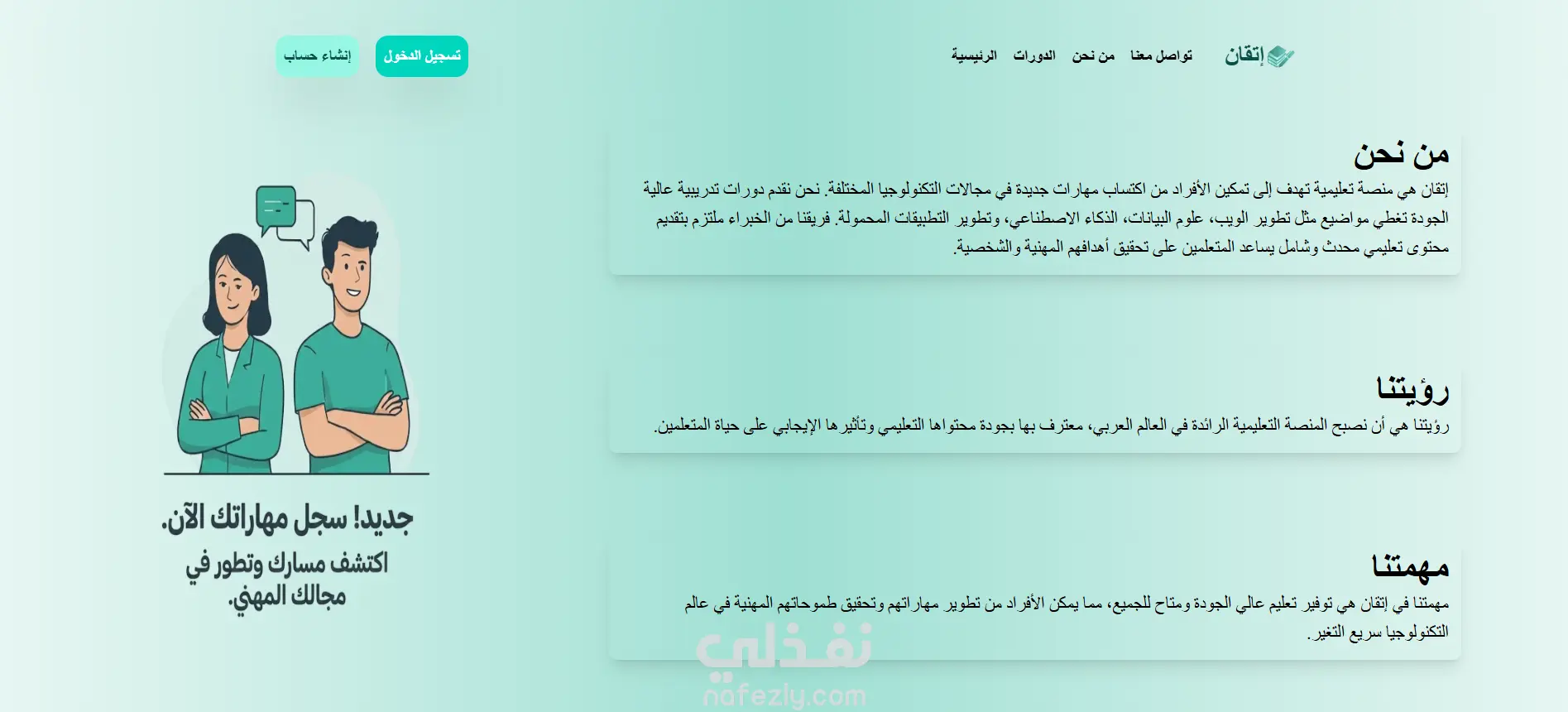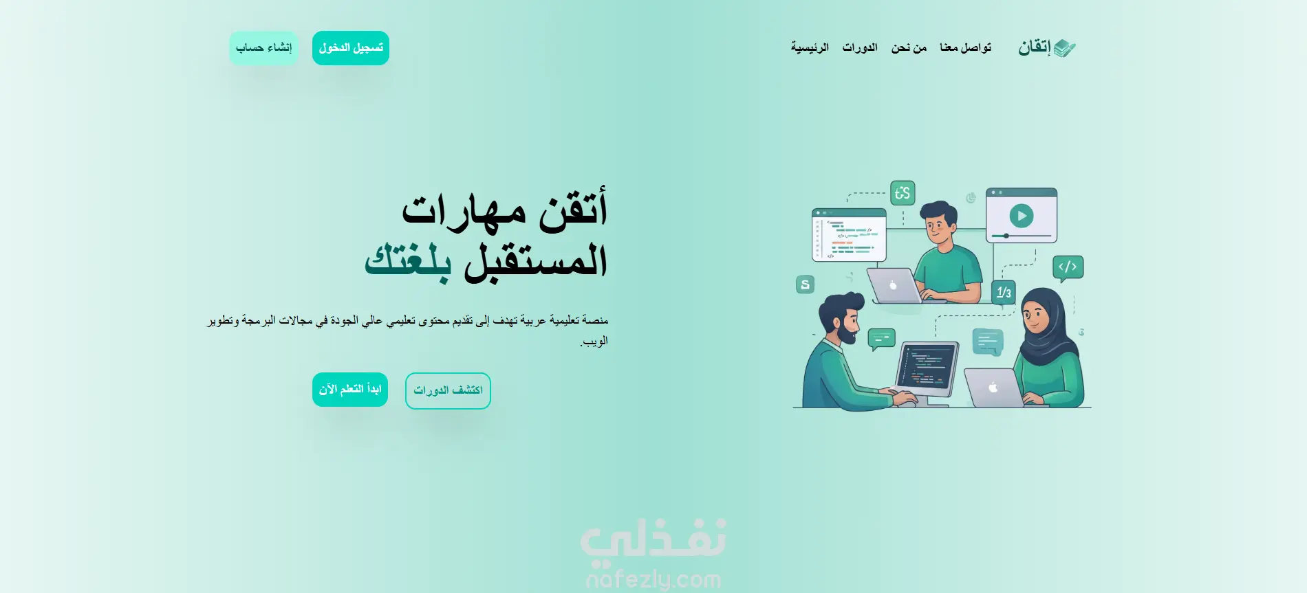 إتقان هو Landing Page تعليمية عربية تهدف إلى تقديم رؤية واضحة لمنصة تعلم إلكتروني موجهة للطلاب والمتعلمين ذاتيًا. تم تصميم الصفحة لعرض فكرة المنصة، مميزاتها، وأهدافها بشكل مبسط وجذاب، مع التركيز على تجربة مستخدم حديثة وسهلة.