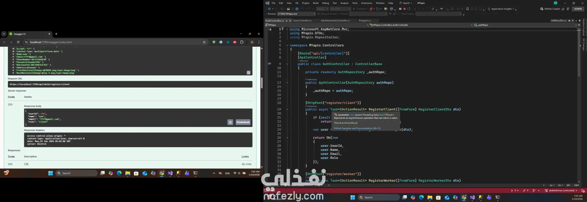 هو مشروع backend يربط م بين تطبيق موبايل بتقنية ال flutter والbackend bب ال asp.net , هو مشروع متاكامل للربط م بين الdatabase وتطبيق الموبايل.