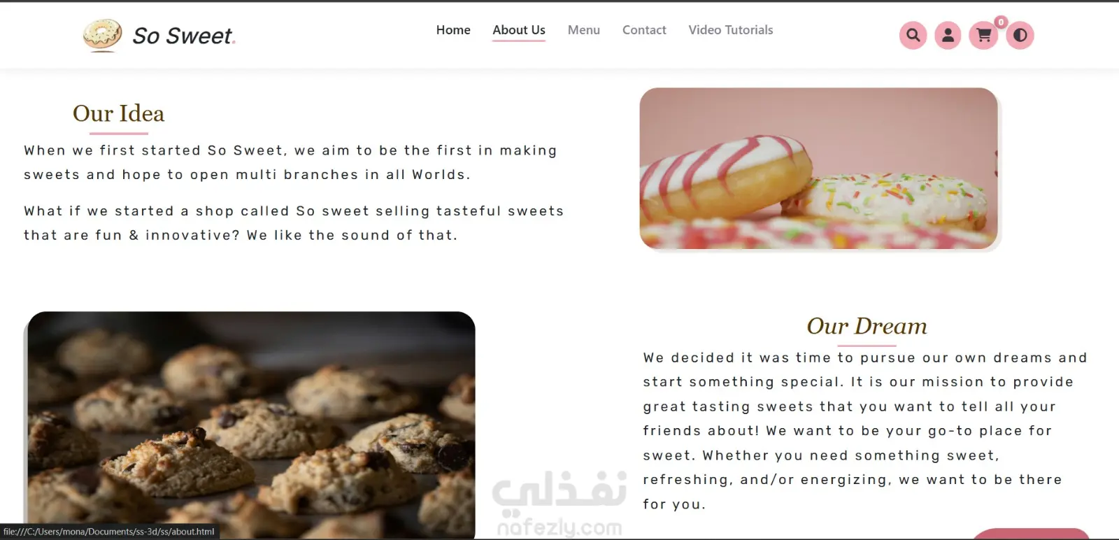 موقع بيعرض منتجات sweets عبارع عن 5 صفح عباره عن المنتجات المتاحه معروضه بشكل جذاب ونبذه عن المكان وفوتر فيه لينكات التواصل وطريقه التواصل وصفحه login وسله لعرض المنتجات وضفت معاه نظام الdarkmode