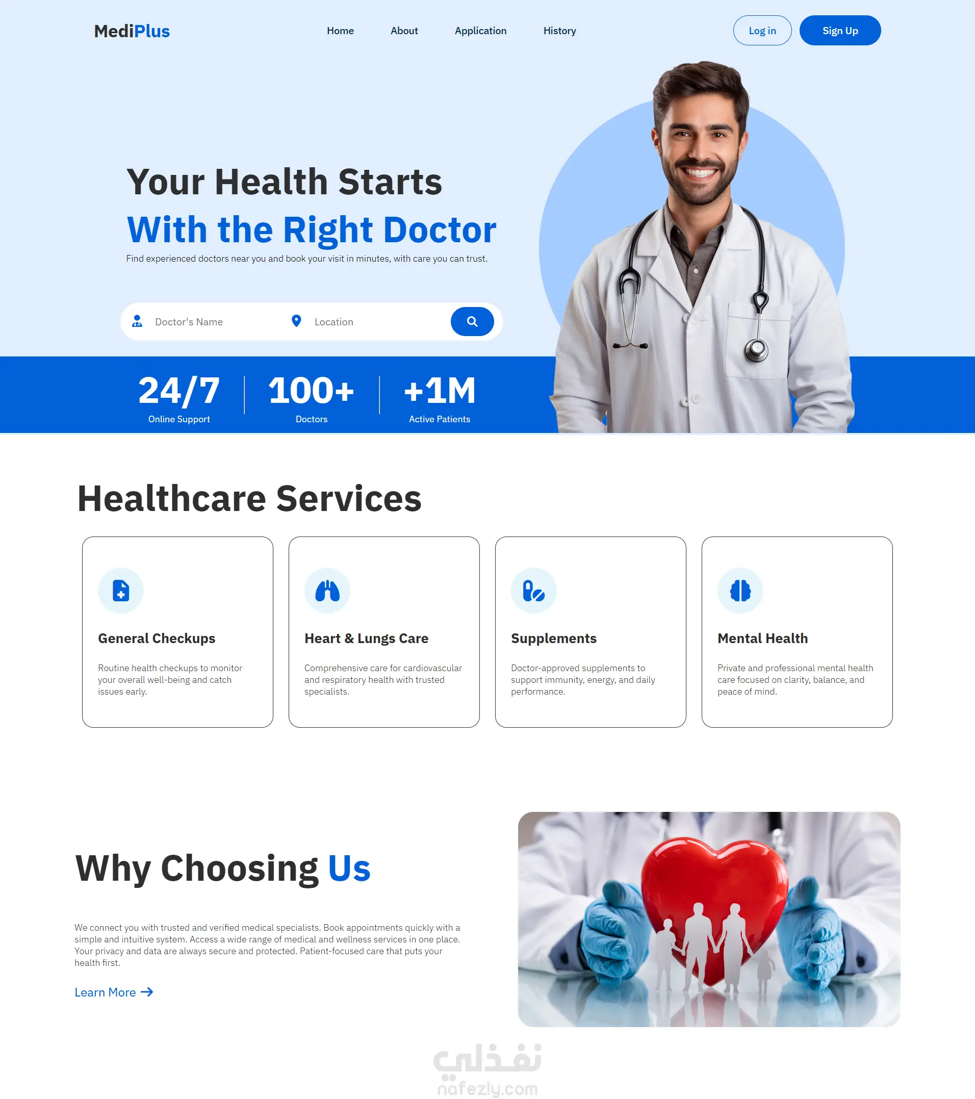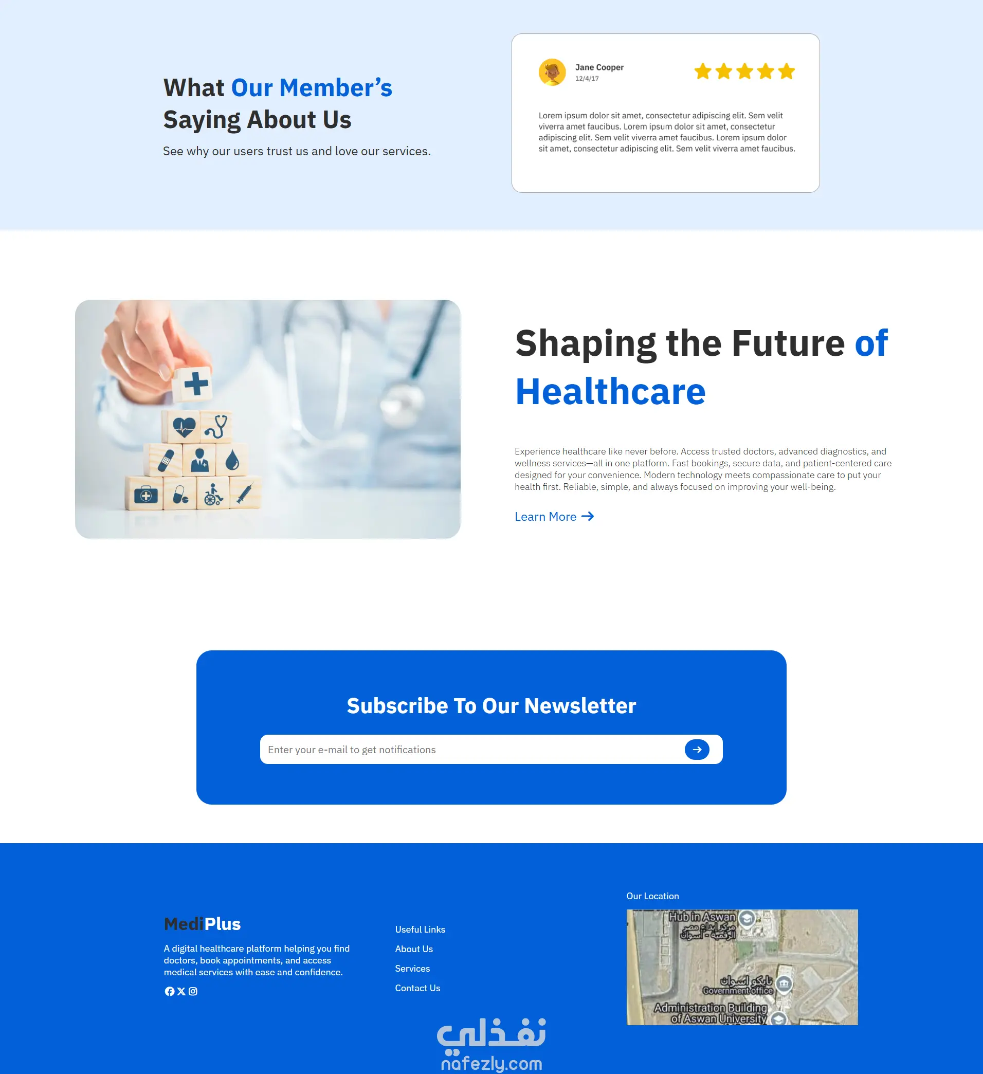 MediPlus هو مشروع منصة رعاية صحية رقمية تهدف إلى تسهيل الوصول للخدمات الطبية بطريقة بسيطة وآمنة، حيث تساعد المستخدمين على البحث عن الأطباء، حجز المواعيد، والاطلاع على الخدمات الطبية بكل سهولة وثقة. تم تصميم وتطوير المشروع مع التركيز على تجربة المستخدم (UX) وواجهة استخدام واضحة وسلسة تناسب جميع الفئات، مع الالتزام بأحدث معايير تصميم وتطوير الويب. مميزات المشروع واجهة مستخدم حديثة وسهلة الاستخدام تصميم متجاوب يعمل بكفاءة على جميع الأجهزة (Desktop – Tablet – Mobile) تنظيم واضح للمحتوى والخدمات الطبية تجربة استخدام مريحة تساعد المستخدم على الوصول للمعلومة بسرعة التقنيات المستخدمة HTML5 لبناء هيكل الموقع CSS3 لتنسيق الواجهات وتحقيق تصميم احترافي JavaScript لإضافة التفاعلية وتحسين تجربة المستخدم Bootstrap / Tailwind CSS (إن كنت مستخدم واحد فيهم) لضمان تصميم متجاوب وسريع Figma لتصميم واجهات المستخدم قبل التنفيذ البرمجي