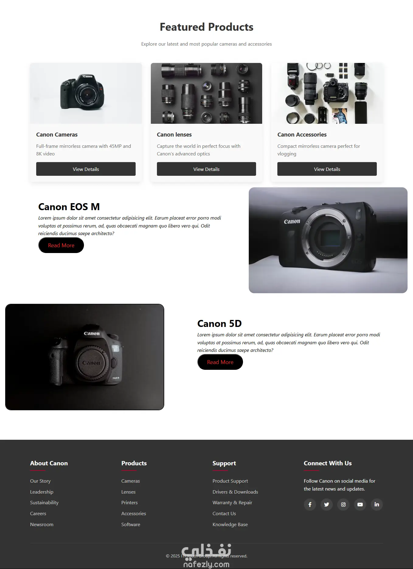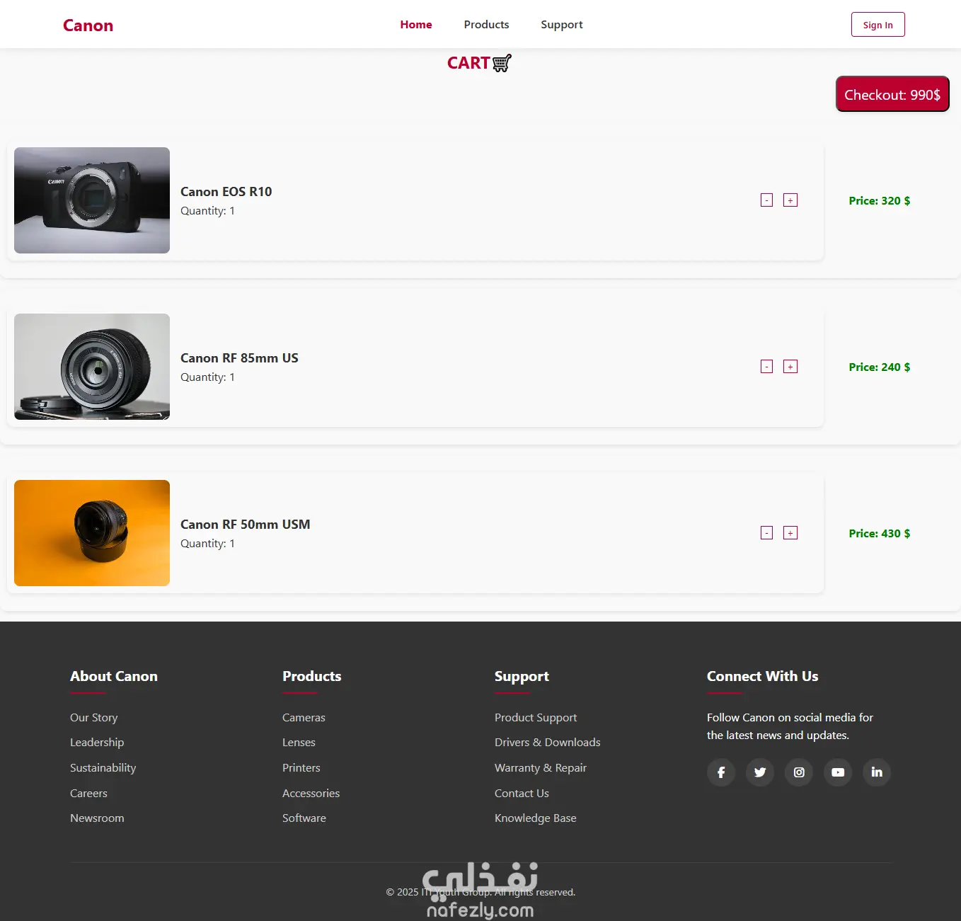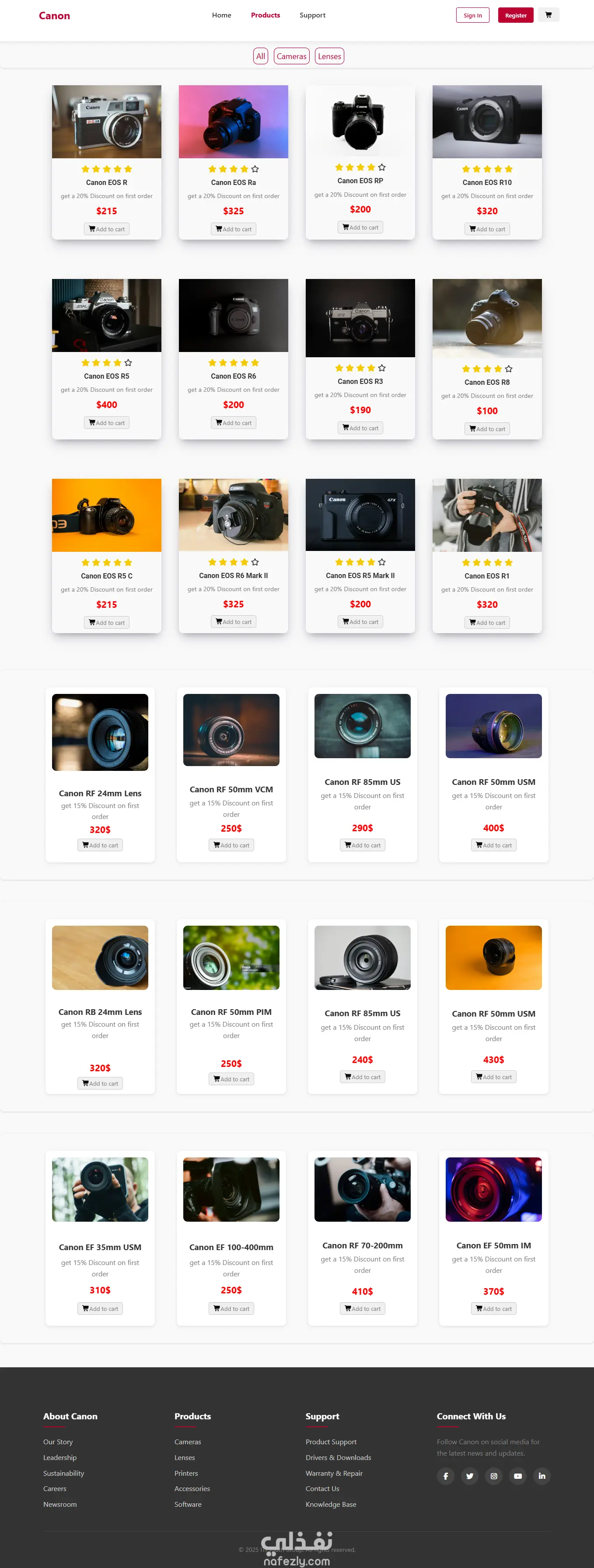 الوصف:- Canon Website قمت بإنشاء وتطوير موقع ويب احترافي مستوحى من هوية Canon، يركز على عرض منتجات كانون من الكاميرات والعدسات بشكل جذاب وحديث. الموقع مصمم بأسلوب نظيف (Clean UI) مع Hero Section قوية، وتجربة استخدام سلسة على جميع الشاشات. أهم المميزات: تصميم متجاوب بالكامل (Responsive Design) صفحة رئيسية جذابة مع Hero Section احترافية. صفحات تسجيل الدخول (Sign In) متوافقة مع الموبايل. تنظيم المحتوى بطريقة واضحة وسهلة التصفح. الاهتمام بالتفاصيل البصرية والألوان المتناسقة مع هوية Canon. تم تنفيذ المشروع ضمن إطار عمل جماعي، مع مساهمة فعالة في تصميم الواجهة وتنفيذ أجزاء الواجهة الأمامية باستخدام HTML, CSS, وJavaScript.