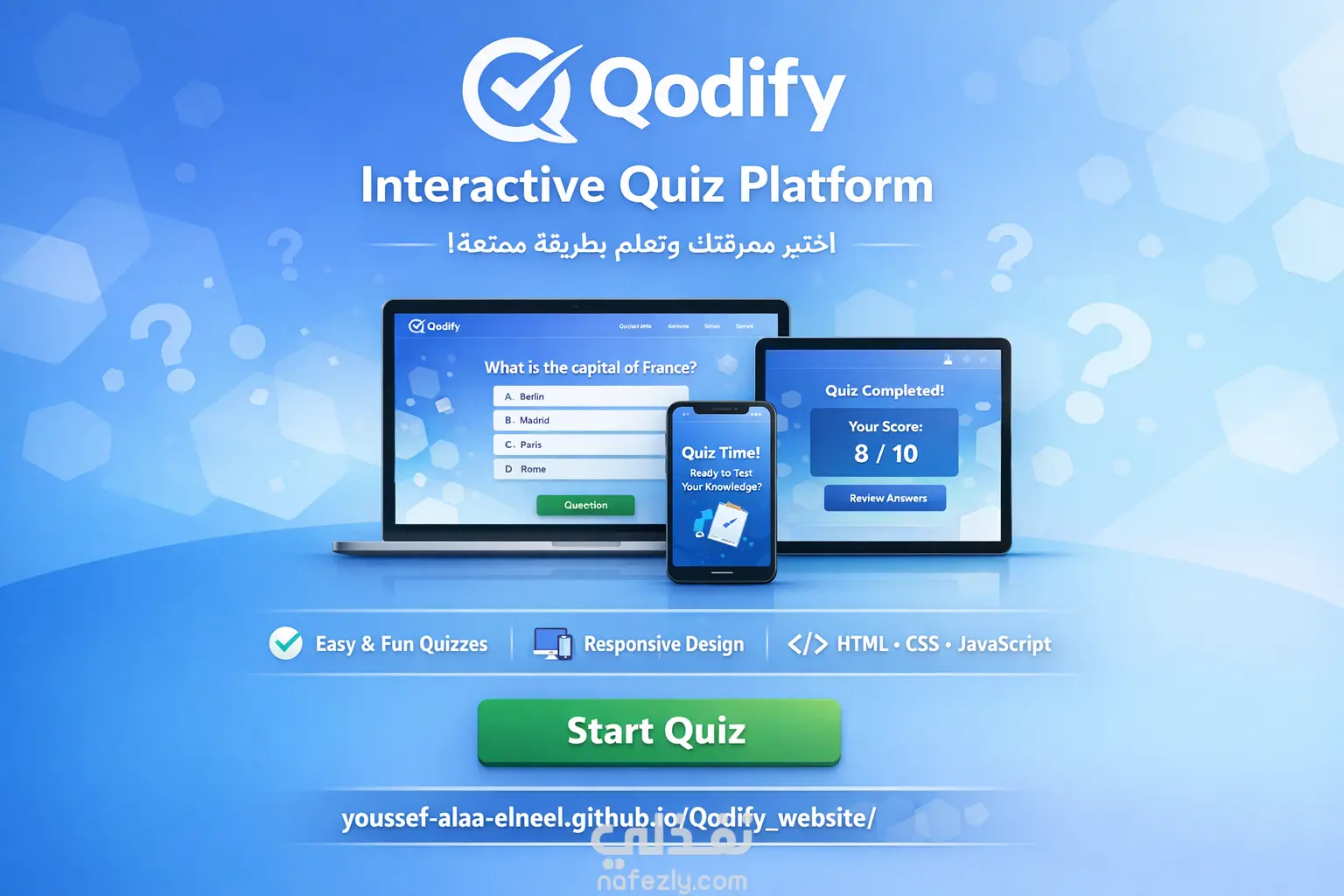 الوصف : Qodify هو موقع ويب تفاعلي لعمل الاختبارات (Quizzes) أونلاين، مصمم بواجهة حديثة وبسيطة تركز على تجربة المستخدم وسهولة الاستخدام. الموقع يتيح للمستخدم الإجابة على مجموعة من الأسئلة بطريقة سلسة، مع عرض النتيجة النهائية بشكل واضح، مما يجعله مناسبًا للمشاريع التعليمية، الترفيهية، أو مواقع التدريب والاختبارات. مميزات الموقع: • واجهة مستخدم نظيفة وعصرية (Clean UI) • تجربة استخدام سهلة وسريعة • تصميم Responsive يعمل بكفاءة على جميع الشاشات (موبايل – تابلت – كمبيوتر) • تفاعل مباشر مع المستخدم أثناء الاختبار •كود منظم وقابل للتطوير لاحقًا التقنيات المستخدمة: • HTML5 • CSS3 • JavaScript استخدامات الموقع: • منصات تعليمية • مواقع اختبارات أونلاين • مشاريع تدريب وتقييم • مواقع ترفيهية تعتمد على الأسئلة