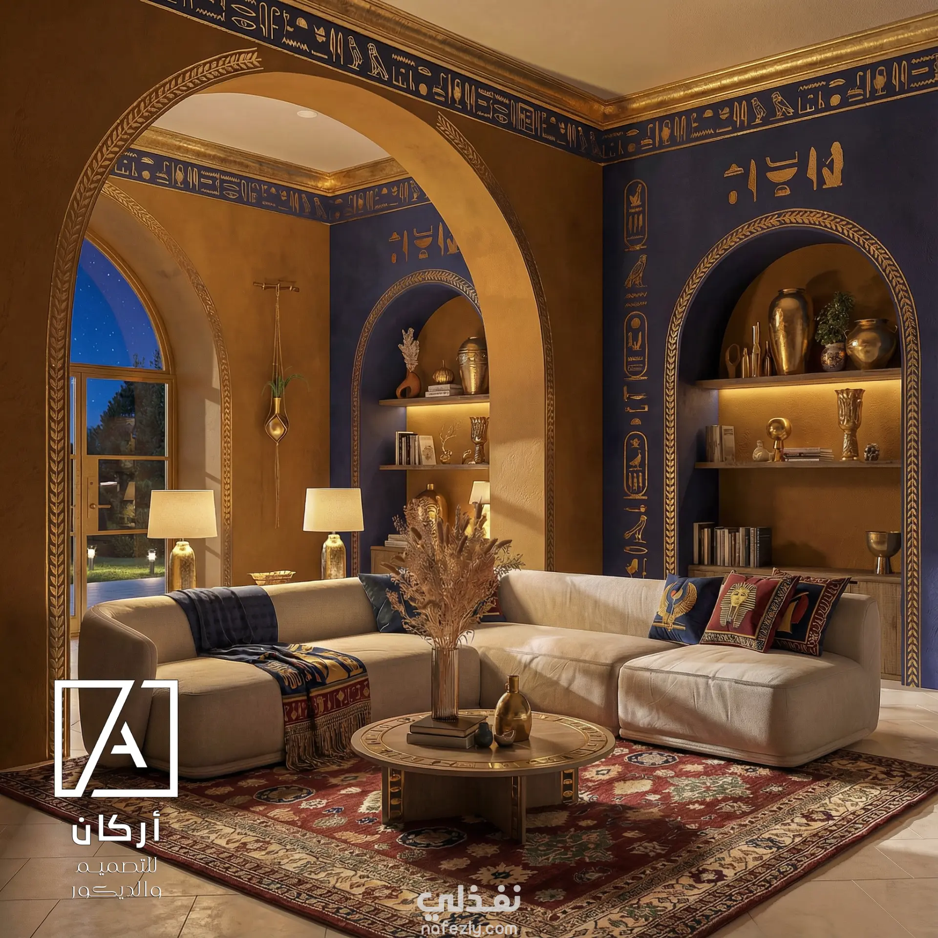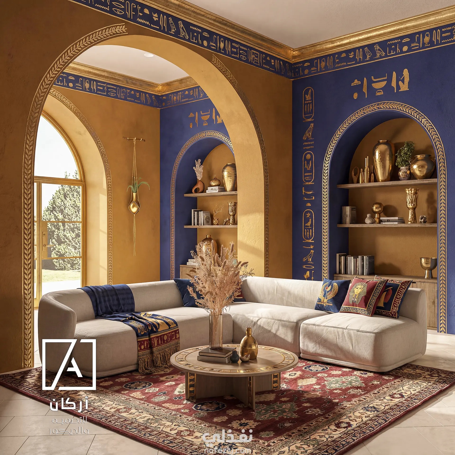 Rich royal blue and warm gold tones dominate the palette, inspired by classical Egyptian temples and royal chambers. Handcrafted hieroglyphic motifs and arched niches frame the space, adding cultural depth and architectural elegance without overwhelming the modern layout.