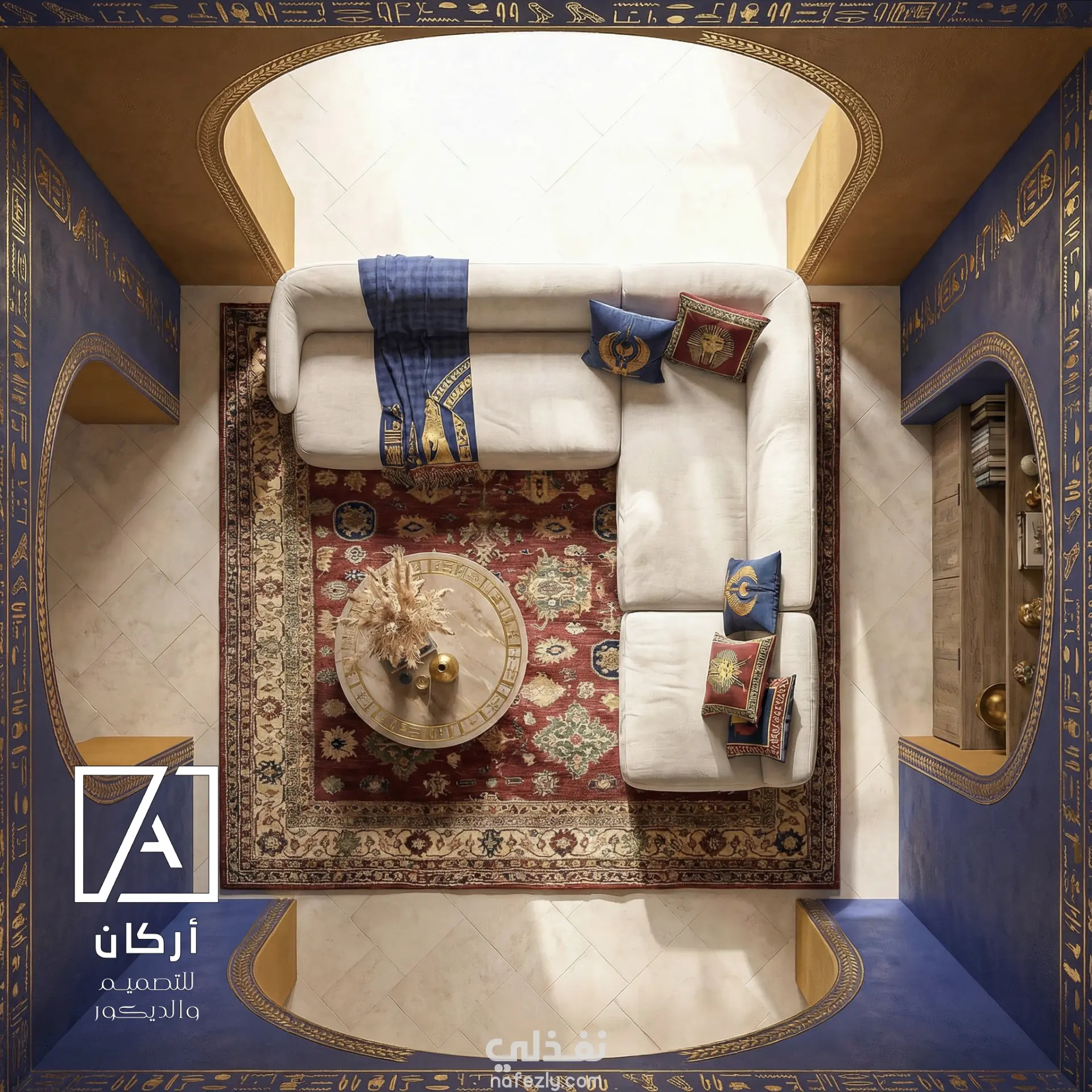 The furniture selection focuses on clean, soft forms to balance the strong visual identity of the walls. A neutral sectional sofa anchors the space, while custom cushions, decorative objects, and curated accessories reinforce the Egyptian narrative with subtle sophistication.
