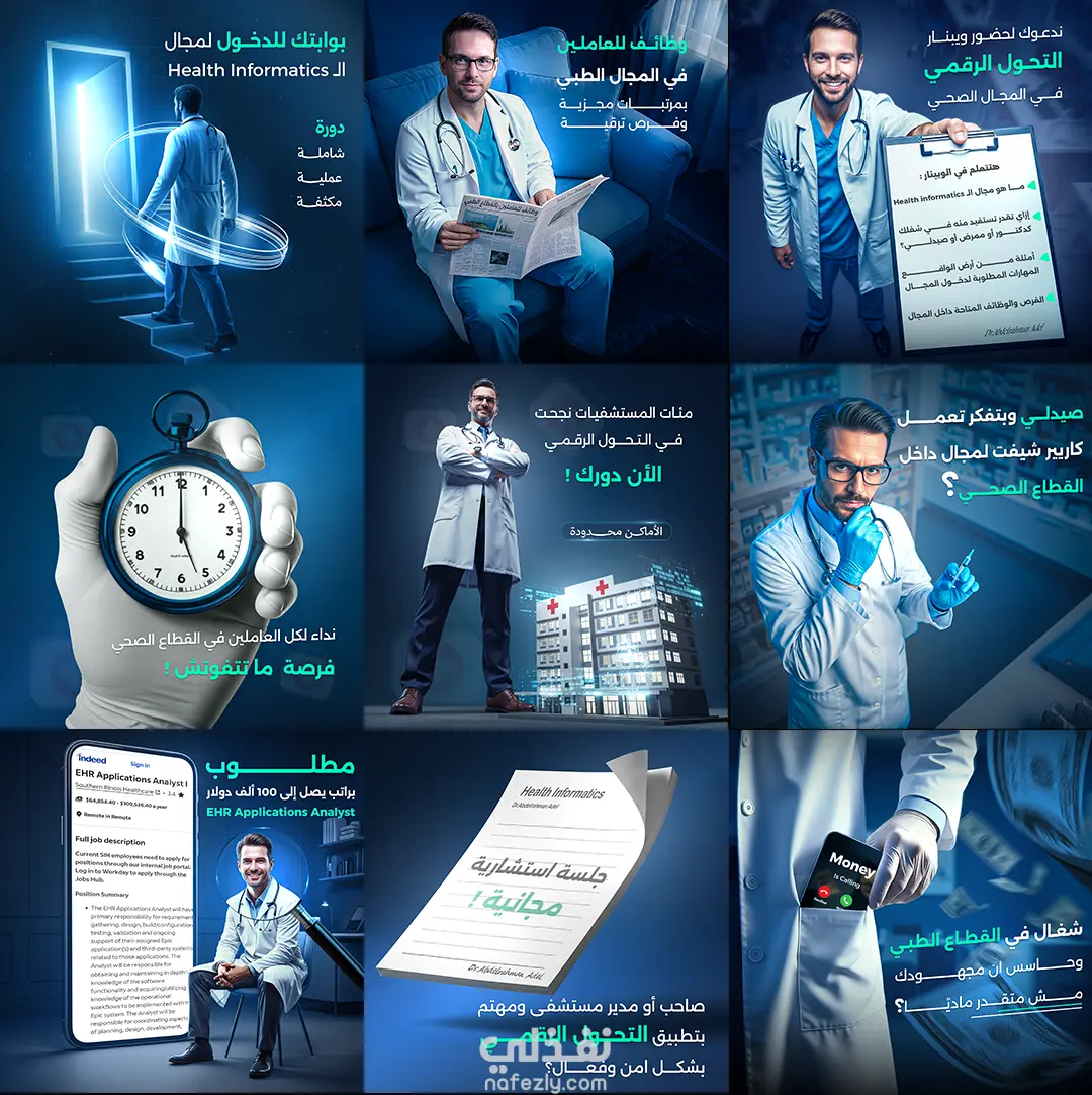 المشروع يعرض تصميمات سوشيال ميديا نفذتها لحملة إعلانية في مجال المعلوماتية الصحية، بتركّز على الدمج بين الطب والتكنولوجيا. دوري كان تنفيذ تصميمات تحوّل الأفكار الطبية المعقدة لمحتوى واضح وبسيط وسهل الوصول للجمهور الطبي.