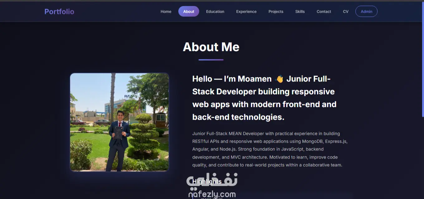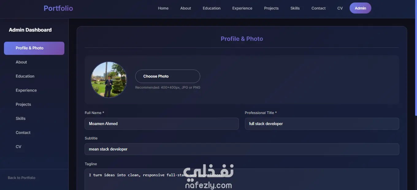 قمت بتصميم وتطوير موقع Portfolio احترافي لعرض الأعمال والمهارات بشكل أنيق وعصري، مع التركيز على سهولة التصفح وتجربة المستخدم. الموقع متجاوب بالكامل مع جميع الأجهزة (كمبيوتر – تابلت – موبايل)، ويحتوي على: صفحة تعريفية شخصية (About Me) عرض الأعمال والمشاريع السابقة بطريقة منظمة قسم المهارات والتقنيات المستخدمة صفحة تواصل سهلة وواضحة تصميم نظيف يعكس الهوية الشخصية أو المهنية تم الاهتمام بسرعة الأداء، تنظيم المحتوى، والكود النظيف لضمان موقع احترافي مناسب لأصحاب الأعمال الحرة والمطورين والمصممين.