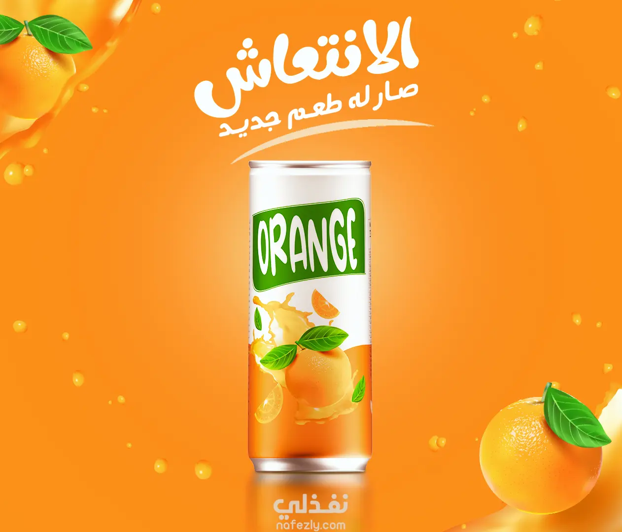 تم تصميم إعلان منتج عصير البرتقال بشكل جذاب يبرز نضارة وطبيعة المنتج. الخلفية باللون البرتقالي الدافئ لتعكس طاقة وحيوية و تعطي الشعور بالانتقاش مع استخدام الون الاخضر لإضفاء لمسة طبيعية وحيوية