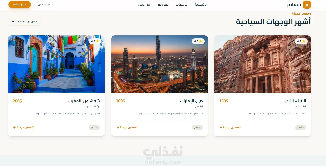 قمت بتصميم وتنفيذ واجهة موقع سياحي يهدف إلى حجز الرحلات واستكشاف الوجهات السياحية بطريقة عصرية وجذابة. ركزت في التصميم على إبراز تجربة المستخدم من خلال صورة رئيسية قوية تعكس روح المغامرة تم تنفيذ العمل باستخدام HTML5 وCSS3 مع الاهتمام بالتناسق اللوني، الخطوط العربية، وسهولة الاستخدام، ليكون مناسبًا لأي منصة حجز أو شركة سياحة. ميزات المشروع: واجهة مستخدم جذابة تعكس مجال السياحة والمغامرات. تجربة استخدام بسيطة وسلسة. ألوان وخطوط متناسقة تناسب الهوية السياحية. كود نظيف ومنظم وسهل التعديل والتطوير. قابل للتطوير والإضافة مستقبلاً (ربط API – نظام حجز – لوحة تحكم).