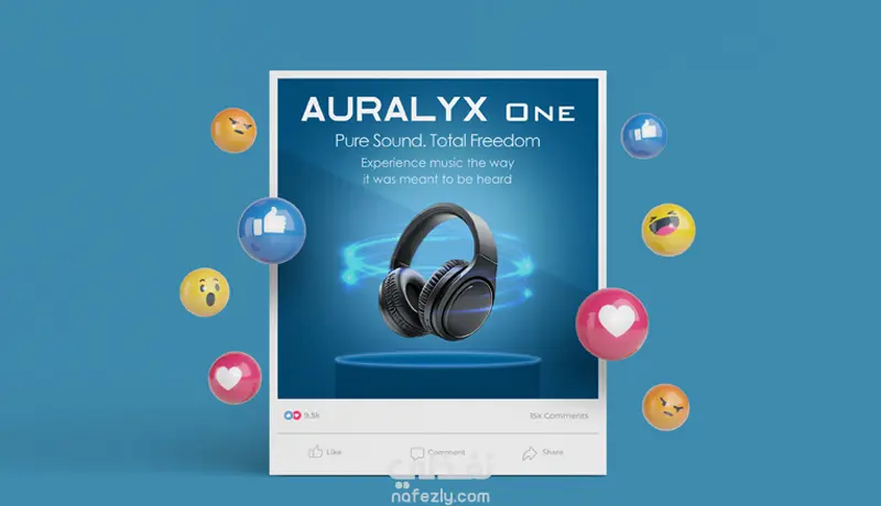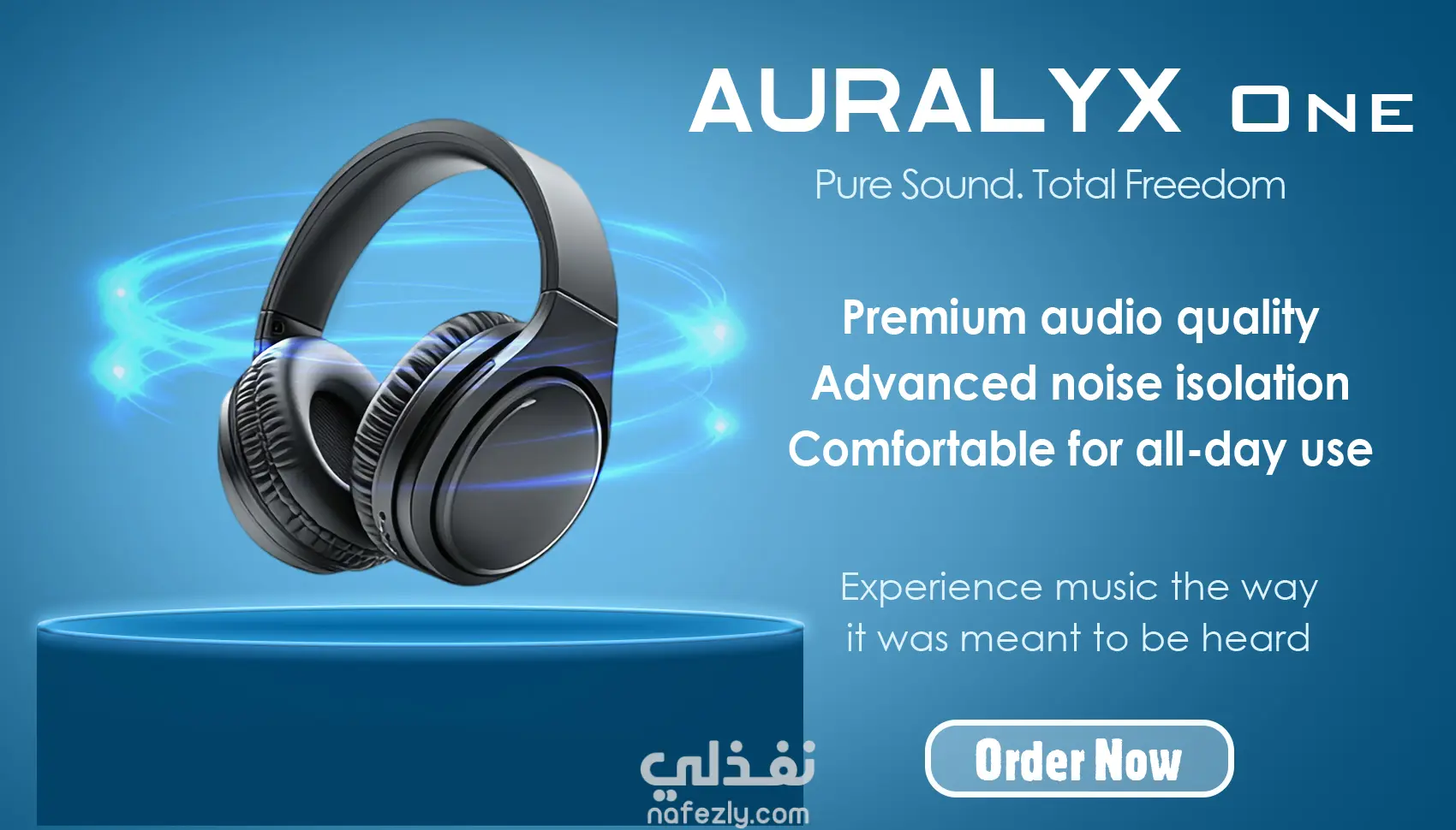 يُبرز التصميم المنتج السماعات كعنصر أساسي، مستخدمًا تأثيرات إضاءة ديناميكية ولوحة ألوان زرقاء هادئة للتعبير عن الوضوح والتكنولوجيا وجودة الصوت العالية.