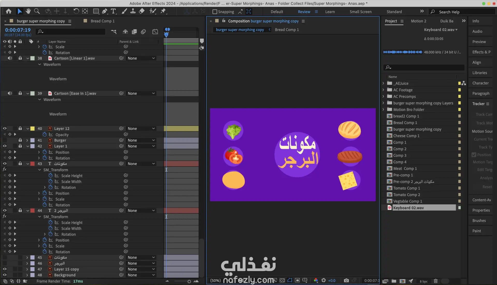 تحريك مشهد كامل بإحترافية وبشكل حيوي وجذاب وتطبيق قواعد التحريك و قواعد الأنيميشن في البداية استلمت ملفات المشروع من الرسام ومصمم الجرافيك ثم قمت بفتح الملفات وفحصها وتنظيمها أول شئ فتحت برنامج Adobe Illustrator وقمت بتفكيك الLayers وتنظيمها وتهيئة العناصر للتحريك ثاني شئ قمت بفتح برنامج Adobe After Effects وعمل Import لملفات ال Illustrator ثالث شئ بدأت بالتحريك ووضع الحركة الاساسية وتطبيق مبادئ وأساسيات التحريك وأساسيات الأنيميشن رابع شئ تنفيذ مهارة الMorphing بإحترافية علي برنامج Adobe After Effects مهارة الMorphing وحدة من أهم مهارات التحريك في الموشن جرافيك وهي تحول العنصر من شكل إلي شكل أخر بطريقة سلاسة ومريحة للعين خامس شئ قمت بفتح الGraph Editor لضبط سرعة الحركة وجعلها اكثر نعومة وبعد أن انتهيت من التحريك قمت بالمراجعة علي المشروع بالكامل وتحسين الحركة لجعلها أكثر سلاسة ومرونة سادس شئ قمت بأضافة المؤثرات الصوتية الSound Effects لجعل المشهد أكثر حيوية ولتحسين تجربة المشاهدة دون استخدام الموسيقى ثم ننتقل إلي أخر مرحلة وهي عملية الRender بإستخدام برنامج Adobe Media Encoder لإستخراج ملف Adobe After Effects وتحويله إلي فيديو MP4 بأعلي جودة Full-HD هذا كان شرح ل أهم تفاصيل المشروع بإختصار