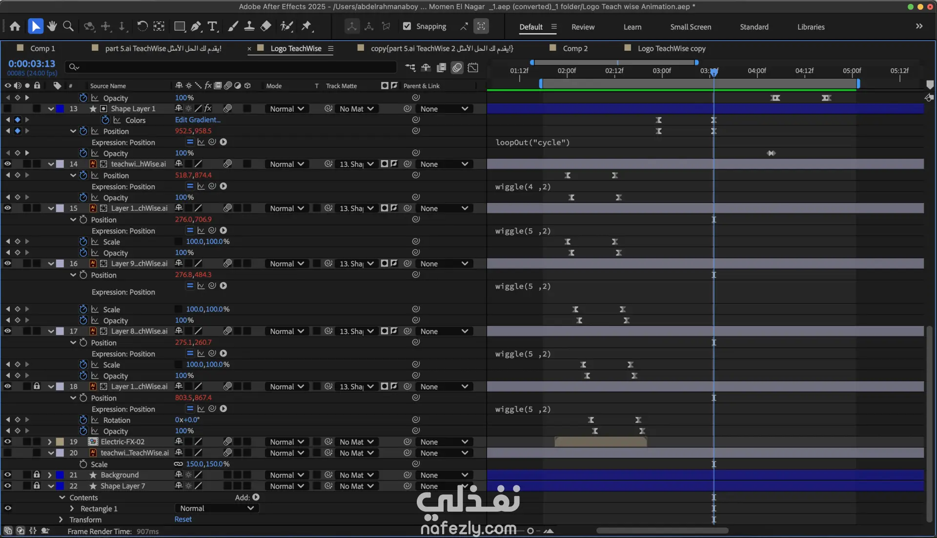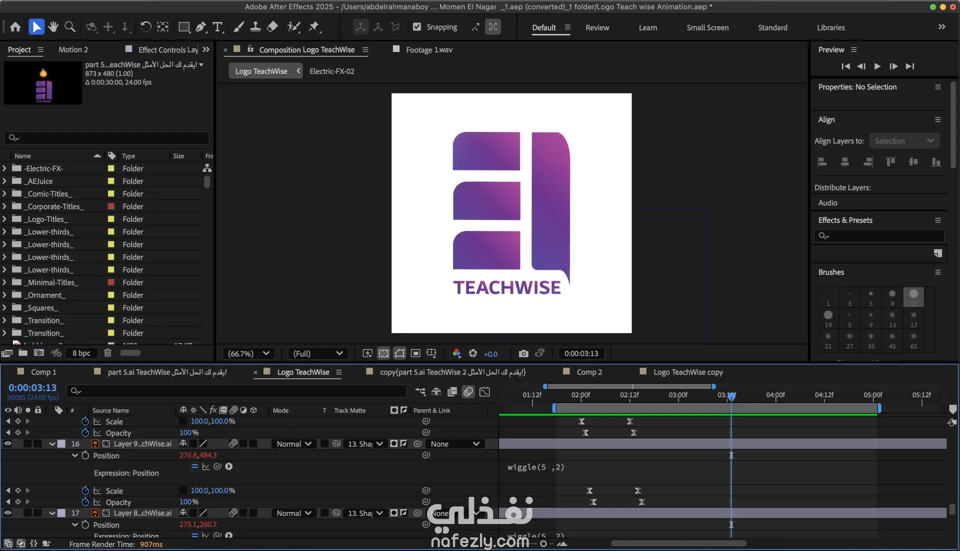 تحريك شعار لمنصة TeachWise في البداية استلمت ملفات المشروع من العميل ثم قمت بفتح الملفات وفحصها وتنظيمها أول شئ فتحت برنامج Adobe Illustrator وقمت بتفكيك الLayers وتنظيمها وتهيئة العناصر للتحريك ثاني شئ قمت بفتح برنامج Adobe After Effects وعمل Import لملفات ال Illustrator ثالث شئ بدأت بالتحريك ووضع الحركة الاساسية وتطبيق مبادئ وأساسيات التحريك وأساسيات الأنيميشن رابع شئ قمت بإضافة التعليق الصوتي خامس شئ قمت بفتح الGraph Editor لضبط سرعة الحركة وجعلها اكثر نعومة وبعد أن انتهيت من التحريك قمت بالمراجعة علي المشروع بالكامل وتحسين الحركة لجعلها أكثر سلاسة ومرونة سادس شئ قمت بأضافة المؤثرات البصرية الVisual Effects والمؤثرات الصوتية الSound Effects لجعل المشهد أكثر حيوية ولتحسين تجربة المشاهدة دون استخدام الموسيقى ثم ننتقل إلي أخر مرحلة وهي عملية الRender بإستخدام برنامج Adobe Media Encoder لإستخراج ملف Adobe After Effects وتحويله إلي فيديو MP4 بأعلي جودة Full-HD هذا كان شرح ل أهم تفاصيل المشروع بإختصار