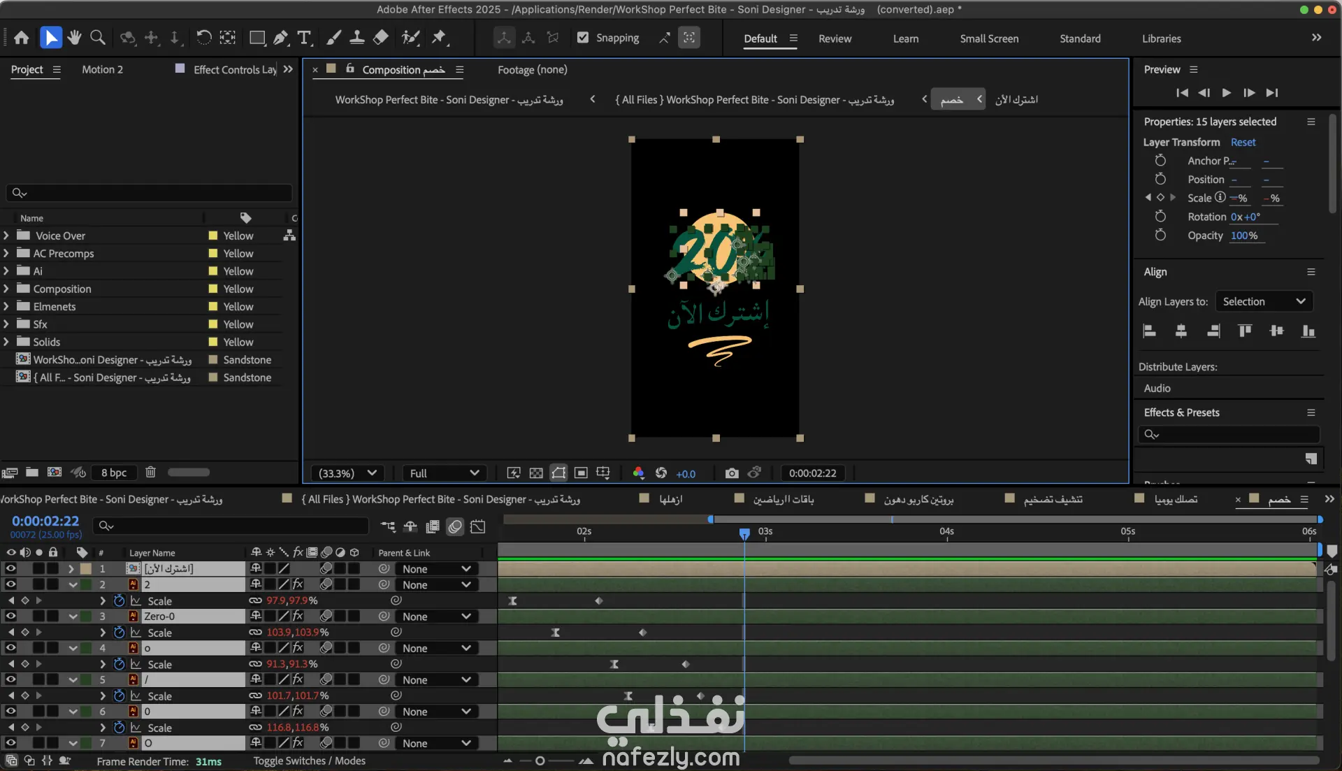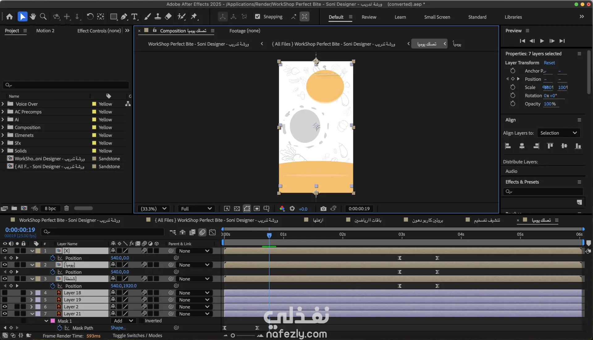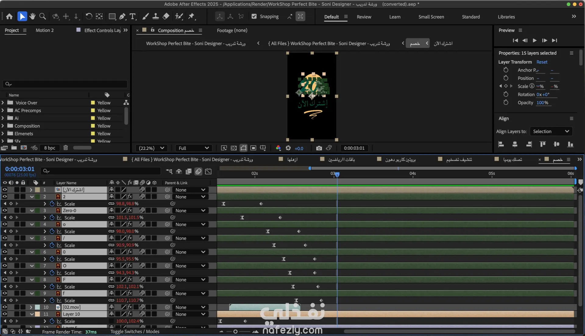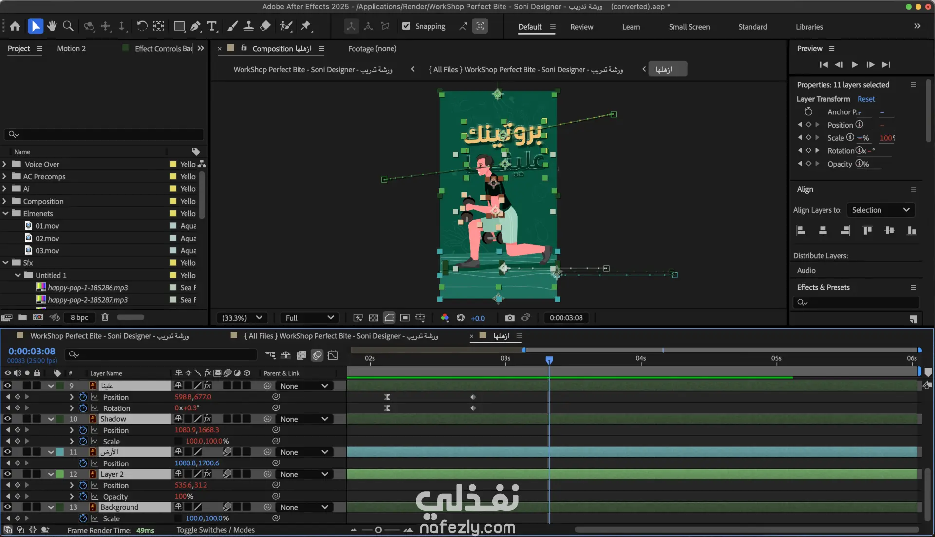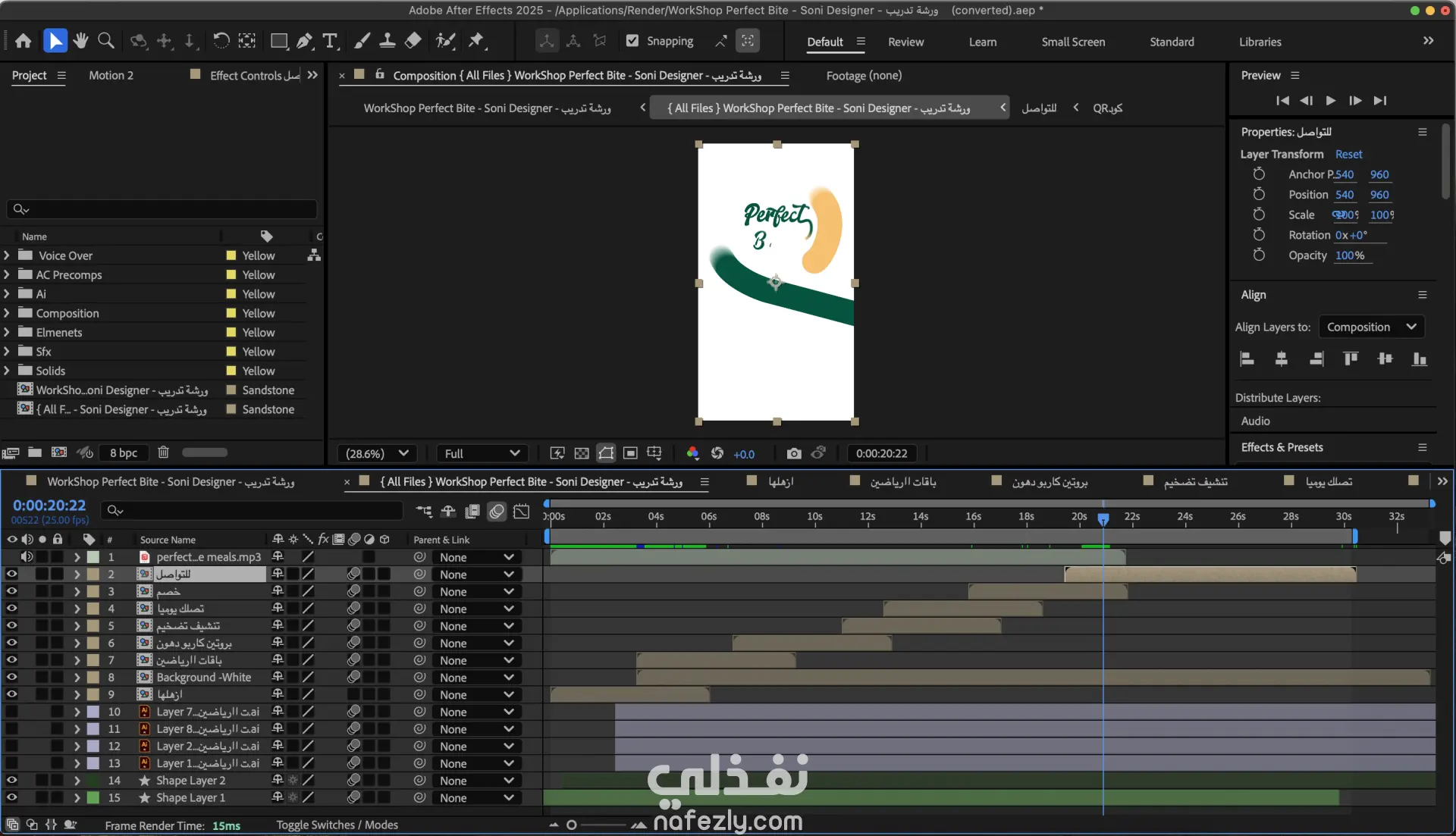 ورشة عمل فيديو موشن جرافيك احترافي لبرفكيت بايت بالمقاس الطولي في البداية استلمت ملفات المشروع ثم قمت بفتح الملفات وفحصها وتنظيمها أول شئ فتحت برنامج Adobe Illustrator وقمت بتفكيك الLayers وتنظيمها وتهيئة العناصر للتحريك ثاني شئ قمت بفتح برنامج Adobe After Effects وعمل Import لملفات ال Illustrator ثالث شئ بدأت بالتحريك ووضع الحركة الاساسية وتطبيق مبادئ وأساسيات التحريك وأساسيات الأنيميشن رابع شئ قمت بإضافة التعليق الصوتي خامس شئ قمت بفتح الGraph Editor لضبط سرعة الحركة وجعلها اكثر نعومة وبعد أن انتهيت من التحريك قمت بالمراجعة علي المشروع بالكامل وتحسين الحركة لجعلها أكثر سلاسة ومرونة سادس شئ قمت بأضافة المؤثرات البصرية الVisual Effects والمؤثرات الصوتية الSound Effects لجعل المشهد أكثر حيوية ولتحسين تجربة المشاهدة دون استخدام الموسيقى ثم ننتقل إلي أخر مرحلة وهي عملية الRender بإستخدام برنامج Adobe Media Encoder لإستخراج ملف Adobe After Effects وتحويله إلي فيديو MP4 بأعلي جودة Full-HD هذا كان شرح ل أهم تفاصيل المشروع بإختصار
