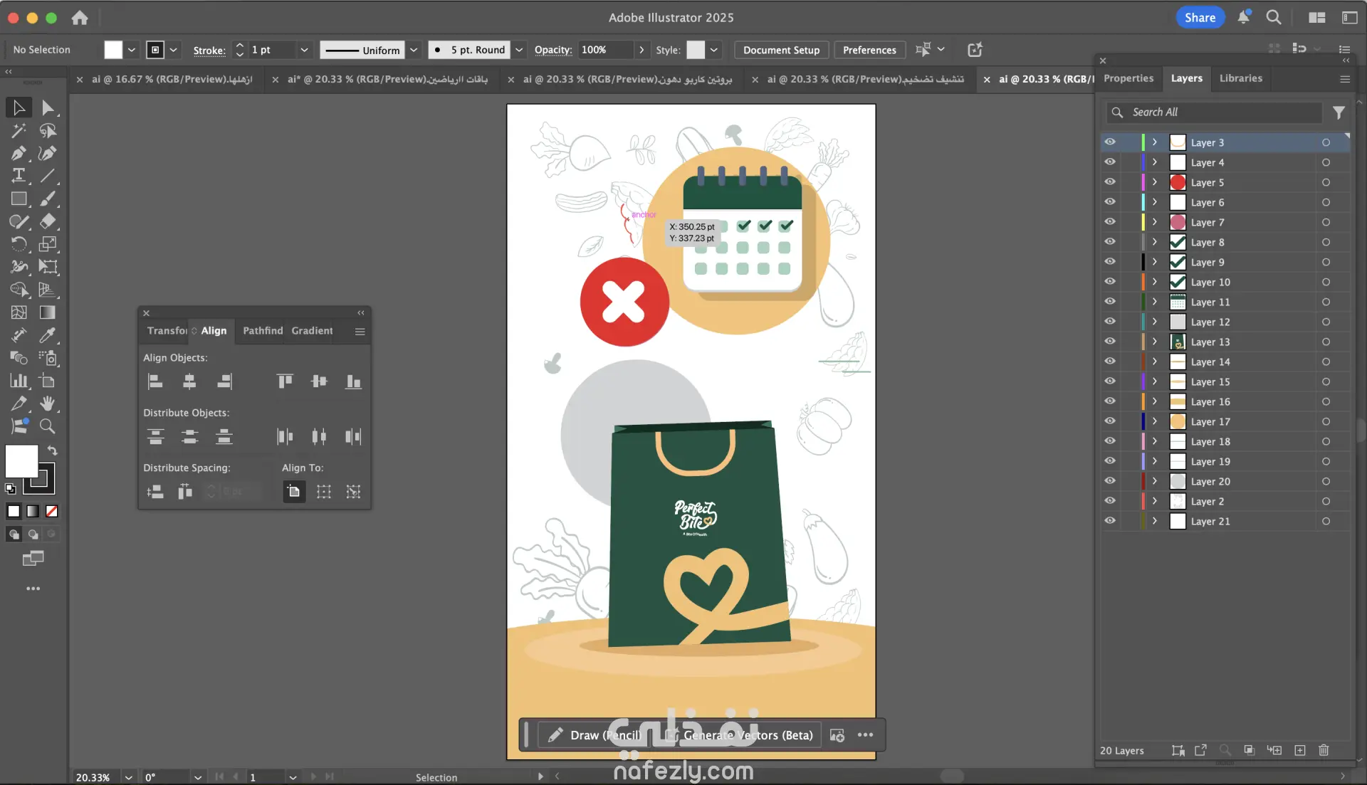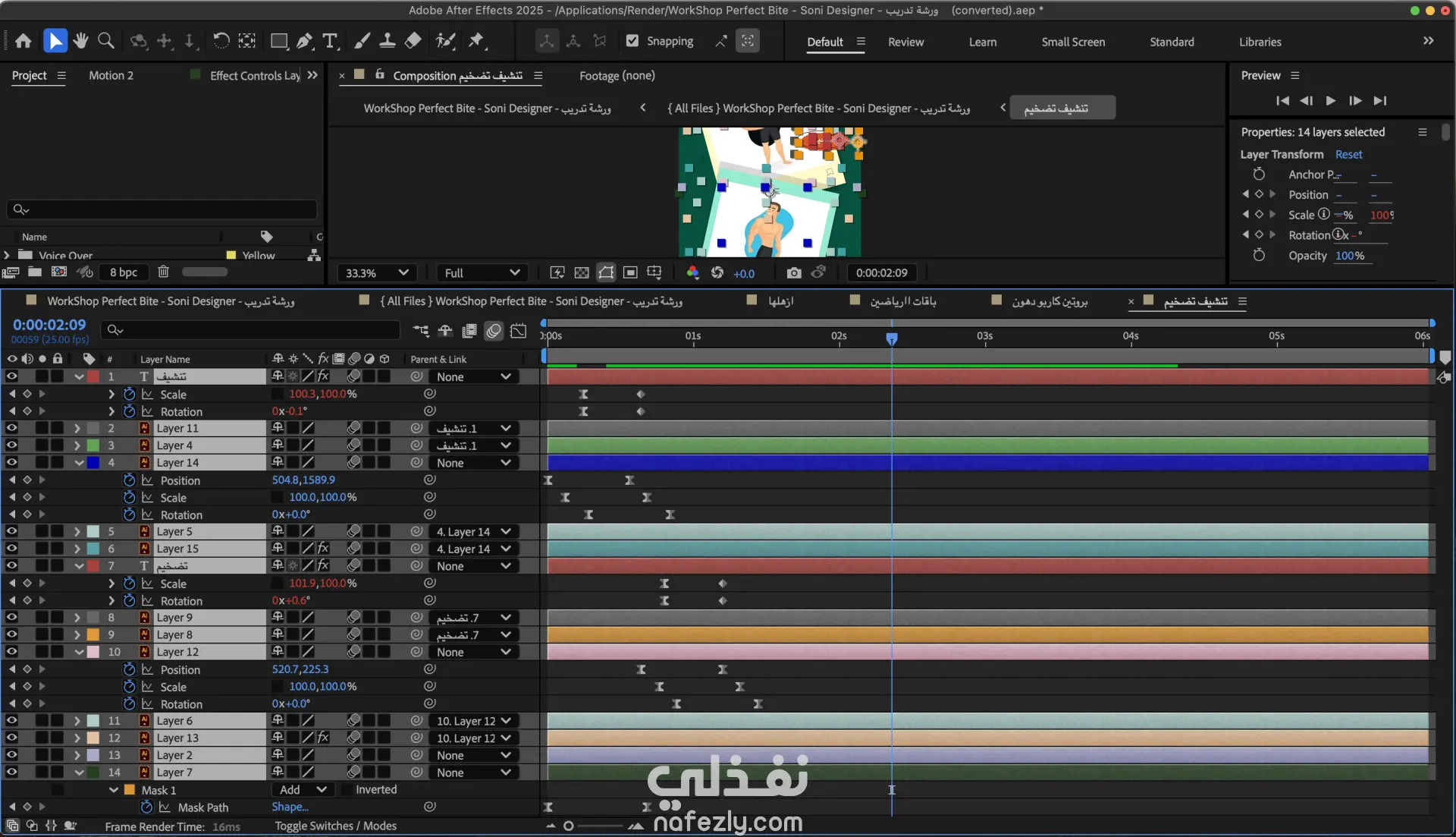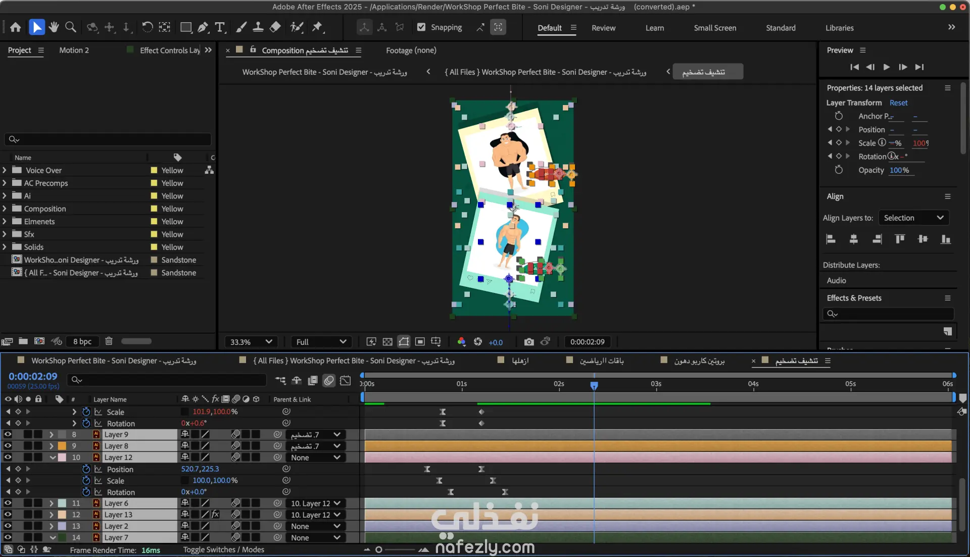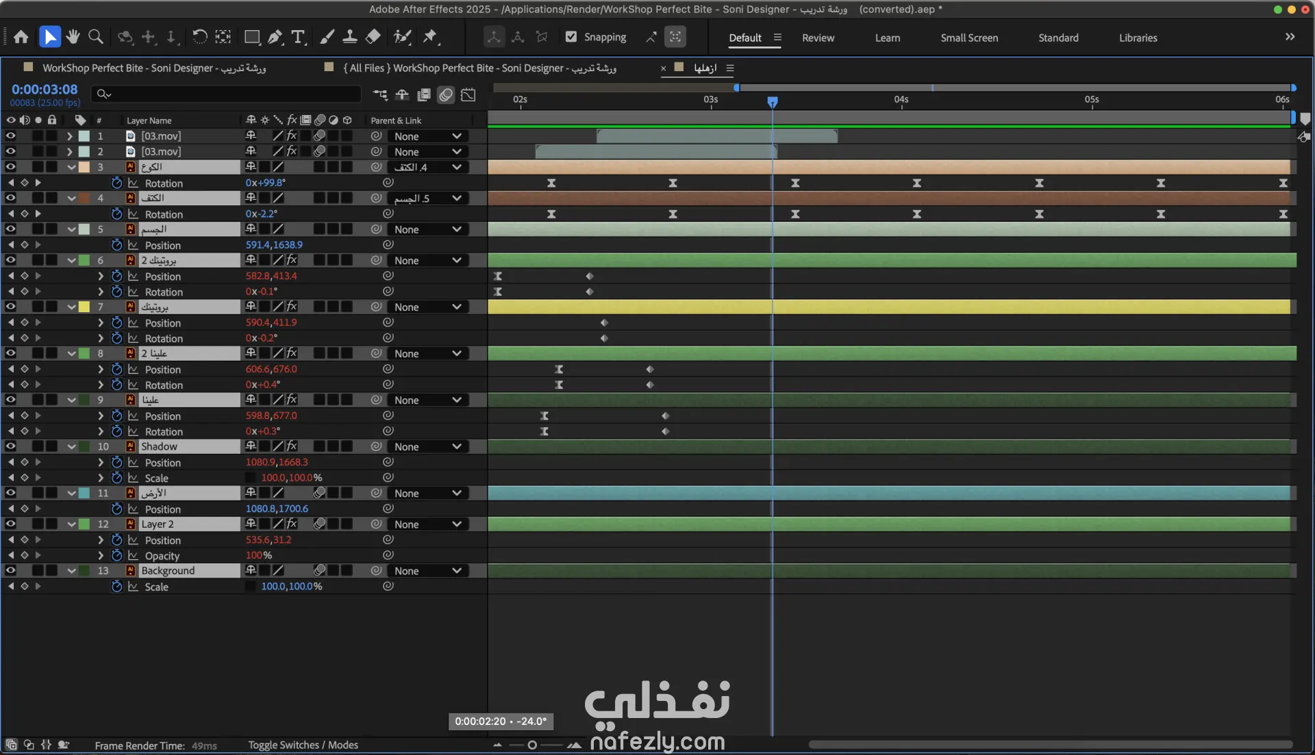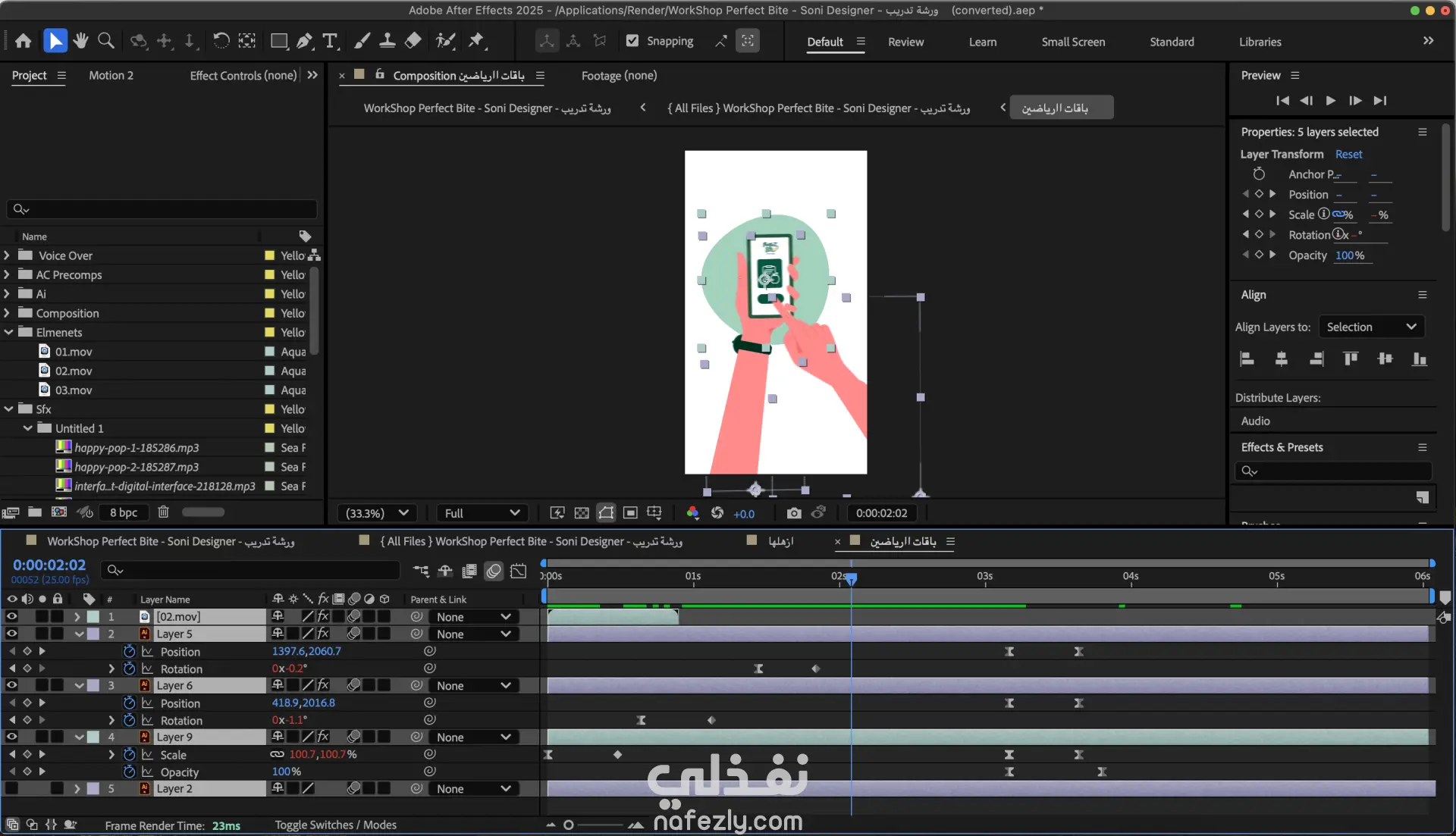 ورشة عمل فيديو موشن جرافيك احترافي لبرفكيت بايت بالمقاس الطولي في البداية استلمت ملفات المشروع ثم قمت بفتح الملفات وفحصها وتنظيمها أول شئ فتحت برنامج Adobe Illustrator وقمت بتفكيك الLayers وتنظيمها وتهيئة العناصر للتحريك ثاني شئ قمت بفتح برنامج Adobe After Effects وعمل Import لملفات ال Illustrator ثالث شئ بدأت بالتحريك ووضع الحركة الاساسية وتطبيق مبادئ وأساسيات التحريك وأساسيات الأنيميشن رابع شئ قمت بإضافة التعليق الصوتي خامس شئ قمت بفتح الGraph Editor لضبط سرعة الحركة وجعلها اكثر نعومة وبعد أن انتهيت من التحريك قمت بالمراجعة علي المشروع بالكامل وتحسين الحركة لجعلها أكثر سلاسة ومرونة سادس شئ قمت بأضافة المؤثرات البصرية الVisual Effects والمؤثرات الصوتية الSound Effects لجعل المشهد أكثر حيوية ولتحسين تجربة المشاهدة دون استخدام الموسيقى ثم ننتقل إلي أخر مرحلة وهي عملية الRender بإستخدام برنامج Adobe Media Encoder لإستخراج ملف Adobe After Effects وتحويله إلي فيديو MP4 بأعلي جودة Full-HD هذا كان شرح ل أهم تفاصيل المشروع بإختصار