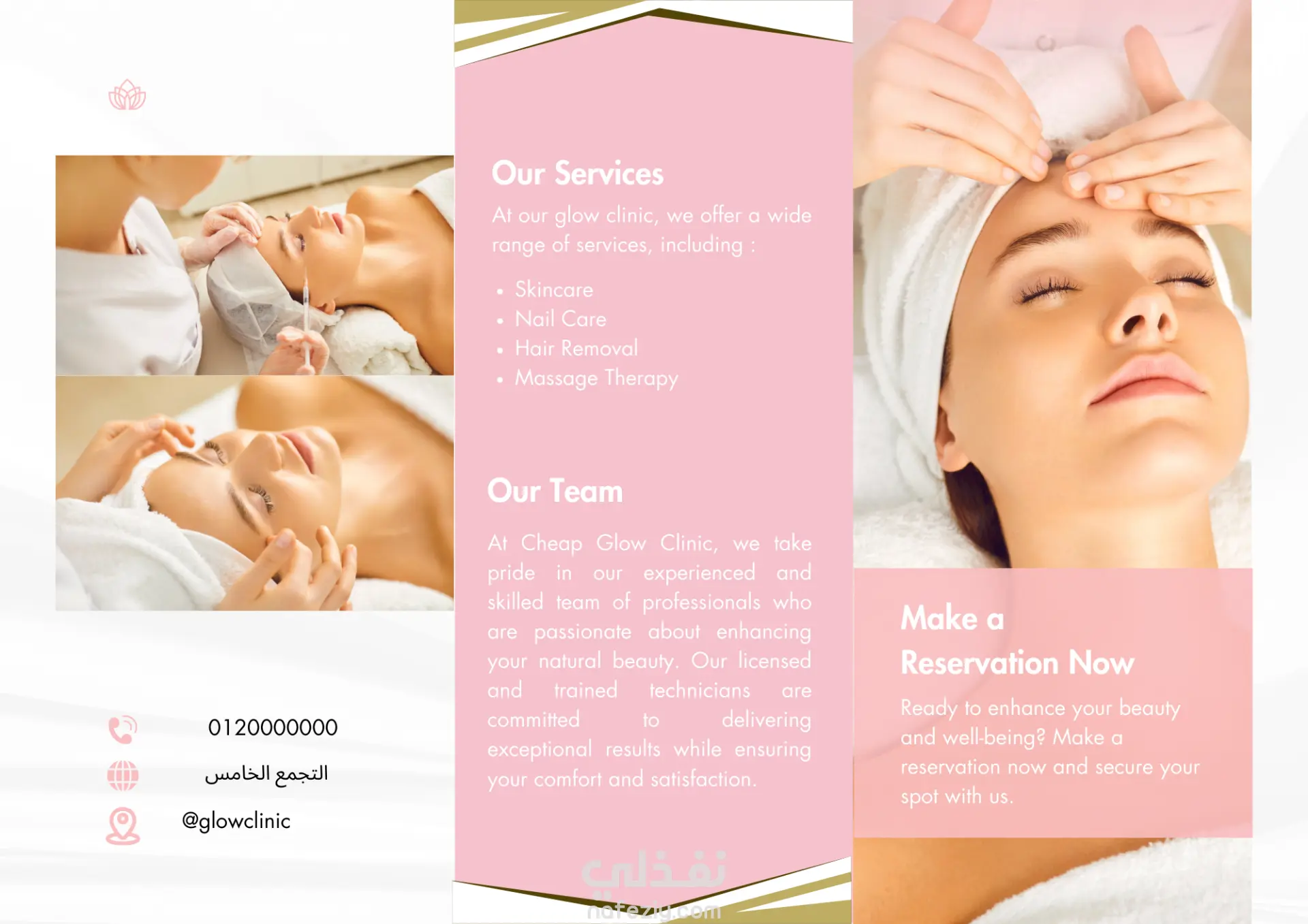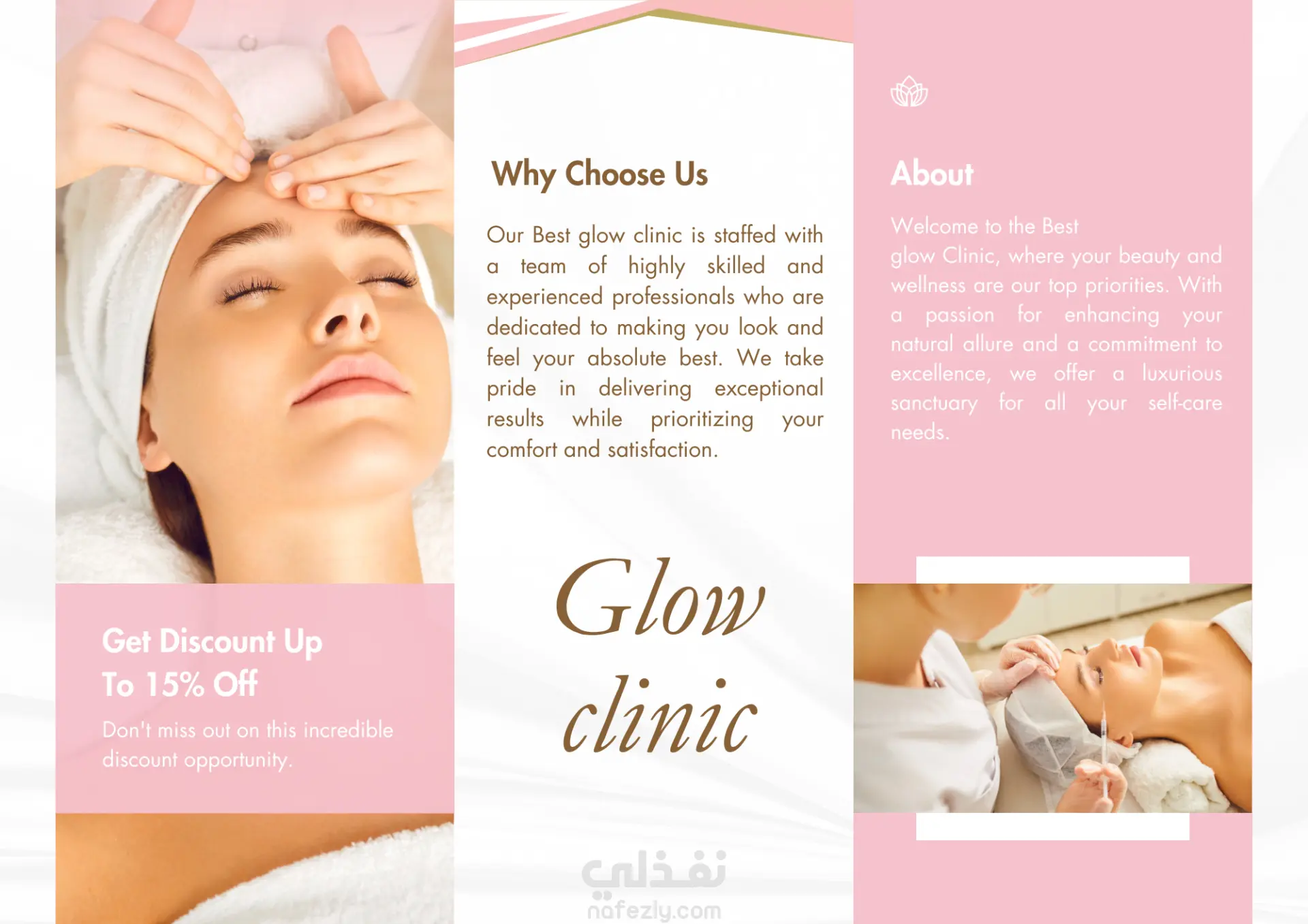 "قمت بتصميم بروشور إعلاني متكامل لعيادة 'Glow Clinic' المتخصصة في التجميل والعناية بالبشرة. ركزت في التصميم على: