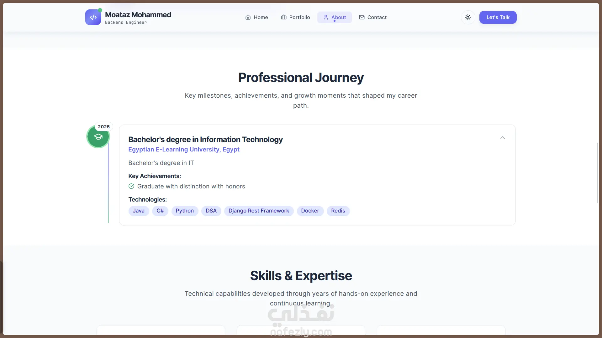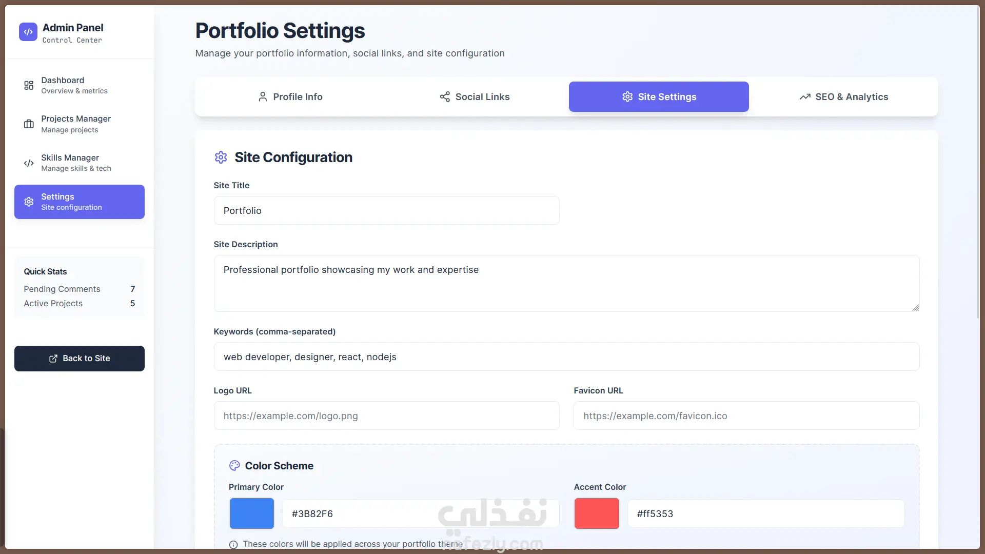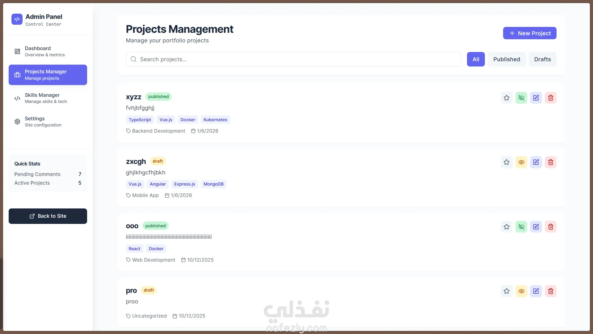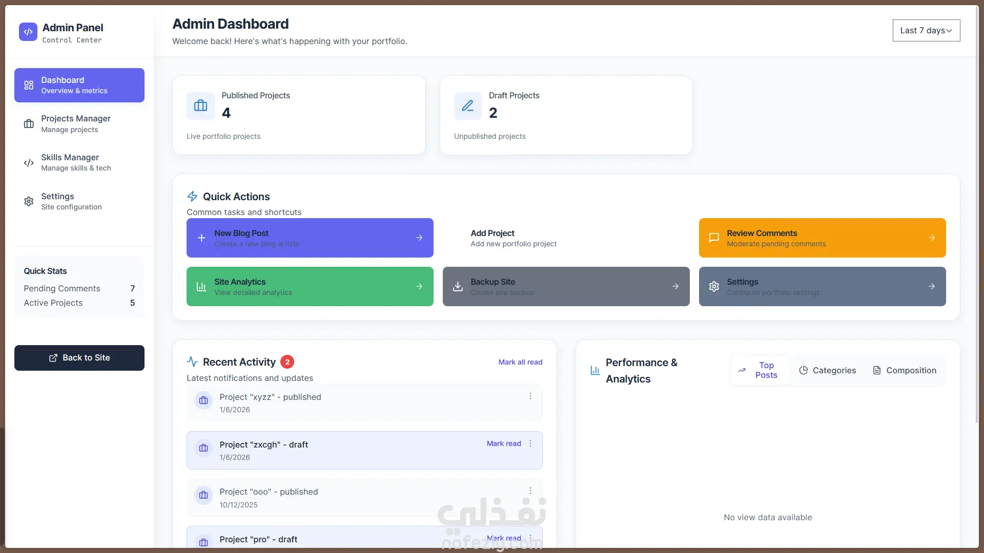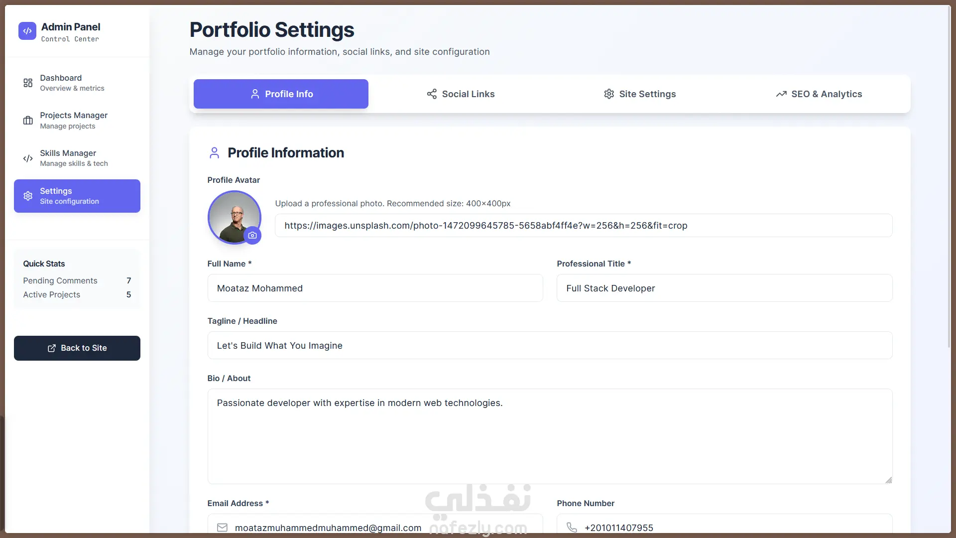 موقع بورتفوليو شخصي مبني كتطبيق Full-Stack يهدف إلى عرض المشاريع والمهارات بطريقة احترافية، مع نظام إدارة محتوى مخصص (Custom CMS) للتحكم الكامل في كل تفاصيل الموقع بدون الاعتماد على أدوات جاهزة. المشروع معمول ليكون أكثر من مجرد صفحة تعريفية، بل منصة ديناميكية قابلة للتوسع تعكس طريقة تفكيري في بناء واجهات حديثة، تنظيم المحتوى، وإدارة البيانات بشكل آمن ومرن. الواجهة الأمامية مبنية باستخدام React.js مع تصميم حديث ومتجاوب، بينما تم الاعتماد على Supabase كـ Backend متكامل لإدارة قاعدة البيانات، المصادقة، والتخزين. الواجهة العامة (Public Portfolio) توفر تجربة تفاعلية لزوار الموقع: قسم Hero ديناميكي مع حركات وانتقالات سلسة عرض المهارات باستخدام عناصر تفاعلية توضح مستوى الإتقان معرض مشاريع قابل للتصفية مع صفحات تفاصيل (Case Studies) نماذج تواصل متعددة (مشاريع – تعاون – تواصل عام) دعم روابط اجتماعية غير محدودة مع اكتشاف تلقائي للأيقونات دعم الوضع الليلي (Dark Mode) مع انتقالات ناعمة تصميم متجاوب بالكامل مع جميع الشاشات Skeleton Loaders لتحسين تجربة المستخدم أثناء التحميل لوحة التحكم (Admin Dashboard) تم بناء لوحة تحكم مخصصة لإدارة الموقع بالكامل: واجهة إدارية متجاوبة مع Sidebar منظم إدارة إعدادات الموقع والملف الشخصي (الاسم، المسمى الوظيفي، النبذة، الصورة، السيرة الذاتية) التحكم في الهوية البصرية (الألوان، اللوجو، الأيقونة) إعدادات SEO (Meta Tags, Analytics) إدارة المهارات وتصنيفها مع تحديد مستوى الإتقان وترتيبها إدارة المشاريع بشكل متقدم: إضافة صور وميديا تحديد التقنيات المستخدمة والمؤشرات كتابة Case Study (المشكلة – الحل – النتيجة) نظام Draft / Published إعدادات SEO لكل مشروع الجوانب التقنية في المشروع: استخدام Supabase (PostgreSQL) مع تفعيل Row Level Security لتأمين البيانات على مستوى قاعدة البيانات إدارة الحالة العامة باستخدام React Context API دعم التحديثات اللحظية (Real-time Subscriptions) نظام حفظ تلقائي (Auto-save) لمنع فقدان البيانات Error Boundaries للتعامل مع الأخطاء بشكل آمن تحسين محركات البحث (SEO) باستخدام Meta Tags و OpenGraph تحسين الأداء عبر Lazy Loading و Code Splitting ما يركز عليه المشروع: بناء CMS مخصص بدل الاعتماد على حلول جاهزة تصميم واجهات حديثة قابلة لإعادة الاستخدام تأمين البيانات من مستوى قاعدة البيانات تنظيم الكود وقابلية الصيانة والتوسع تقديم تجربة مستخدم احترافية وسلسة