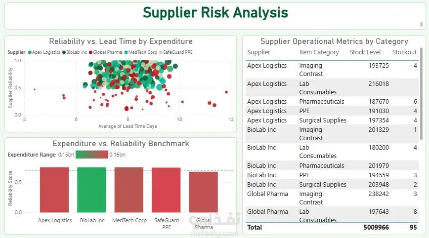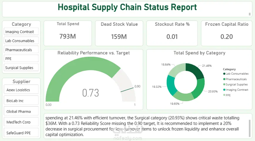 هل تعلم أن 20% من ميزانية المستشفيات قد تكون مجمدة في مخزون راكد (Dead Stock)؟ ده بالضبط اللي اكتشفته في آخر مشروع ليه ! انتهيت من عمل تحليل معمق لمشروع Hospital Supply Chain لتقييم أداء سلسلة التوريد في مستشفى رئيسي، والنتائج كشفت عن فجوات أداء حرجة وفرص تحسين كبيرة قد تنطبق على العديد من المؤسسات الصحية. النتائج الرئيسية: التأثير المالي: • إجمالي الإنفاق السنوي: 793 مليون دولار • قيمة الـ Dead Stock: 159 مليون دولار (20% من الميزانية مجمدة) فجوات الأداء: • الـ Supplier Reliability الحالية: 73% • المستوى المستهدف: 90% • فجوة 17 نقطة تؤثر مباشرة على جودة رعاية المرضى يوجد تكديس كبير في ثلاث فئات رئيسية: لتقليل الـ Dead Stock، يجب خفض الطلبات في: • Surgical Supplies: تخفيض بمقدار 10,907 وحدة • PPE: تخفيض بمقدار 10,514 وحدة • Pharmaceuticals: تخفيض بمقدار 10,450 وحدة الـ Surgical Supplies سجلت أعلى هدر (36.2 مليون دولار في Dead Stock) تقييم مخاطر الموردين: البيانات كشفت عن مشاكل حرجة في أداء الموردين: • High Risk: Global Pharma (8 حوادث Stockout رغم الإنفاق المرتفع) • أفضل أداء: BioLab Inc (أعلى Reliability Rating) • يوجد عدة موردين يظهرون مشاكل متزامنة في الـ Lead Time والـ Reliability