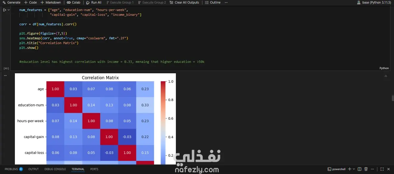 تعاملت مع بيانات تعداد سكاني تتكون من اكثر من 40000 صف و 15 عمود, وذلك من أجل التنبؤ بمستوى الدخل (أقل من أو يساوي 50 ألف دولار أو أكثر من 50 ألف دولار سنويًا) اعتمادًا على مجموعة من الخصائص الديموغرافية والاجتماعية والاقتصادية. قمت بتنظيف ومعالجة البيانات الناقصة, وعمل تحليل استكشافي EDA, feature engineering, data visualization using seaborn, matplotlib. وأخيرا تنفيذ Machine learning اكثر من نموذج مثل logistic regression, random forest, XGBoost, and neural network وذلك للمقارنة بينهم ورؤية أي نموذج يحقق أعلى دقة ممكنة, وكانت XGBoost أعلى دقة 85%, بينما تترواح النماذج الأخرى من 80% - 82%. مع اضافة SHAP ليبين أي feature عززت التبنؤ الصحيح بالدخل والذي اتضح انه العمر.