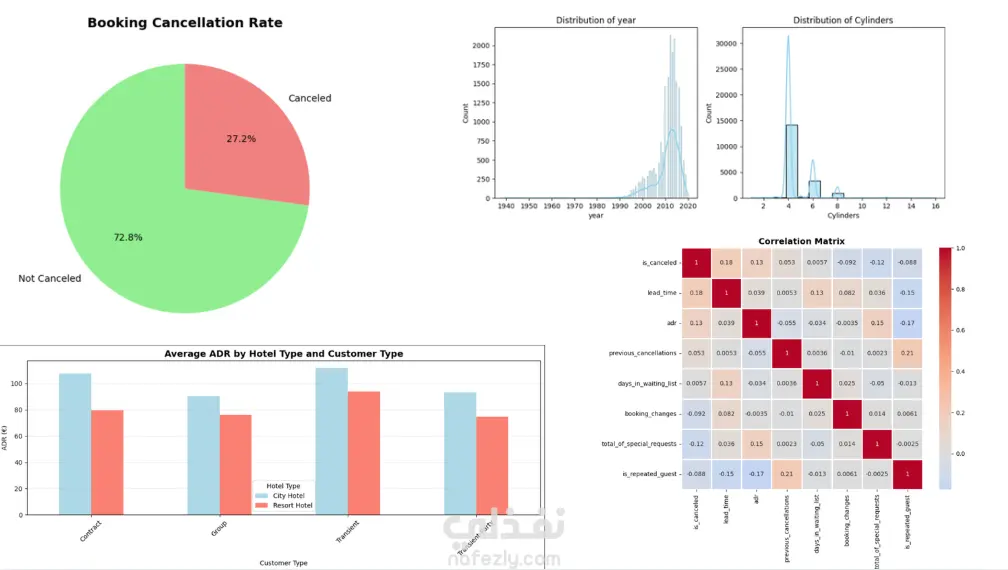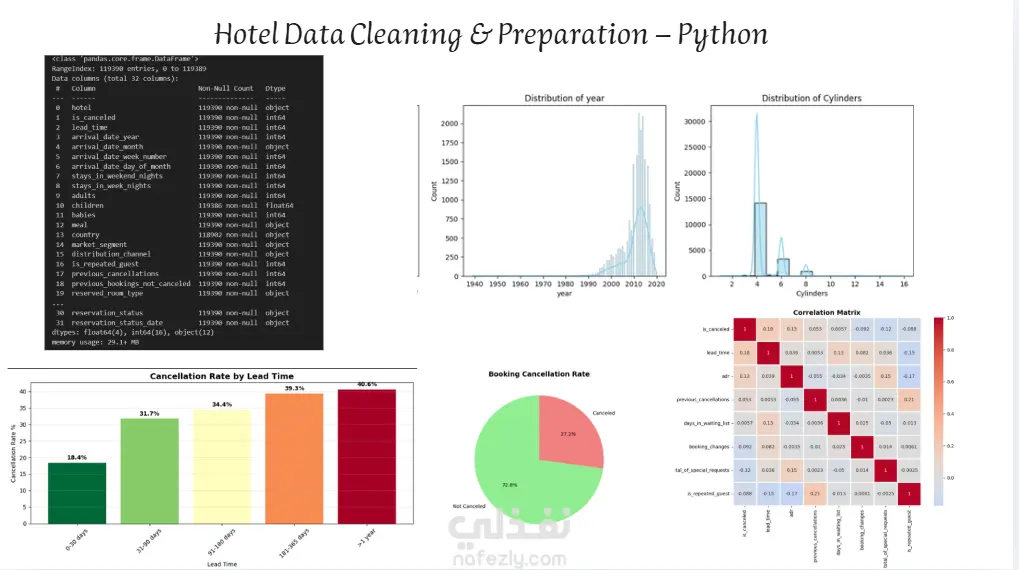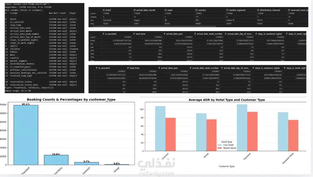 في هذا المشروع، قمتُ بتنظيف وتحضير بيانات فندق باستخدام Python وPandas، بما في ذلك معالجة القيم المفقودة، إزالة البيانات المكررة، وتحويل الأعمدة إلى تنسيقات مناسبة للتحليل. يهدف المشروع إلى توفير بيانات دقيقة ومنظمة يمكن استخدامها لاحقًا لأي تحليل أو إنشاء تقارير ولوحات معلومات.