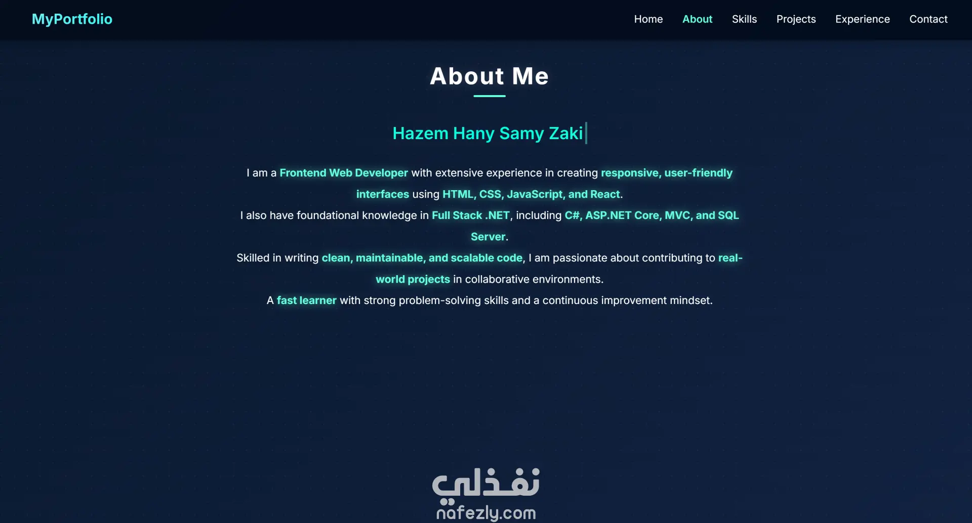 هذا المشروع عبارة عن موقع بورتفوليو شخصي احترافي تم تصميمه وتطويره لعرض المهارات، الخبرات، والمشاريع الخاصة بمطور Front-End بشكل منظم وجذاب. يركّز الموقع على تقديم تجربة مستخدم مريحة، مع تصميم حديث ومتناسق، وتنقل سلس بين الأقسام، ليكون مناسبًا لعرض الهوية المهنية بشكل احترافي سواء لأصحاب المشاريع أو فرق العمل. 🔹 أقسام الموقع: الصفحة الرئيسية (تعريف مختصر وهوية شخصية) نبذة عني المهارات التقنية مع مؤشرات مستوى المشاريع السابقة مع وصف لكل مشروع الخبرات العملية نموذج تواصل 🔹 أبرز مميزات المشروع: تصميم متجاوب يعمل بكفاءة على جميع الشاشات (Desktop – Tablet – Mobile) واجهة مستخدم حديثة ونظيفة (Modern UI) تنظيم واضح للمحتوى وسهولة التصفح استخدام مكونات قابلة لإعادة الاستخدام أداء جيد وسرعة تحميل مناسبة 🔹 التقنيات المستخدمة: HTML5 CSS3 JavaScript React Vite تم تنفيذ المشروع مع التركيز على جودة الكود، قابلية التطوير، وتجربة المستخدم، ليكون مثالًا عمليًا على بناء مواقع بورتفوليو احترافية باستخدام تقنيات الويب الحديثة.