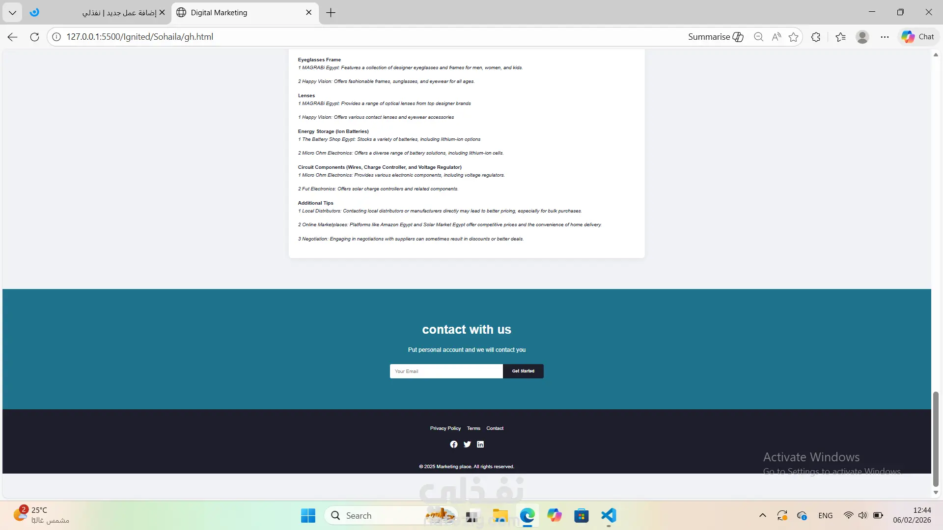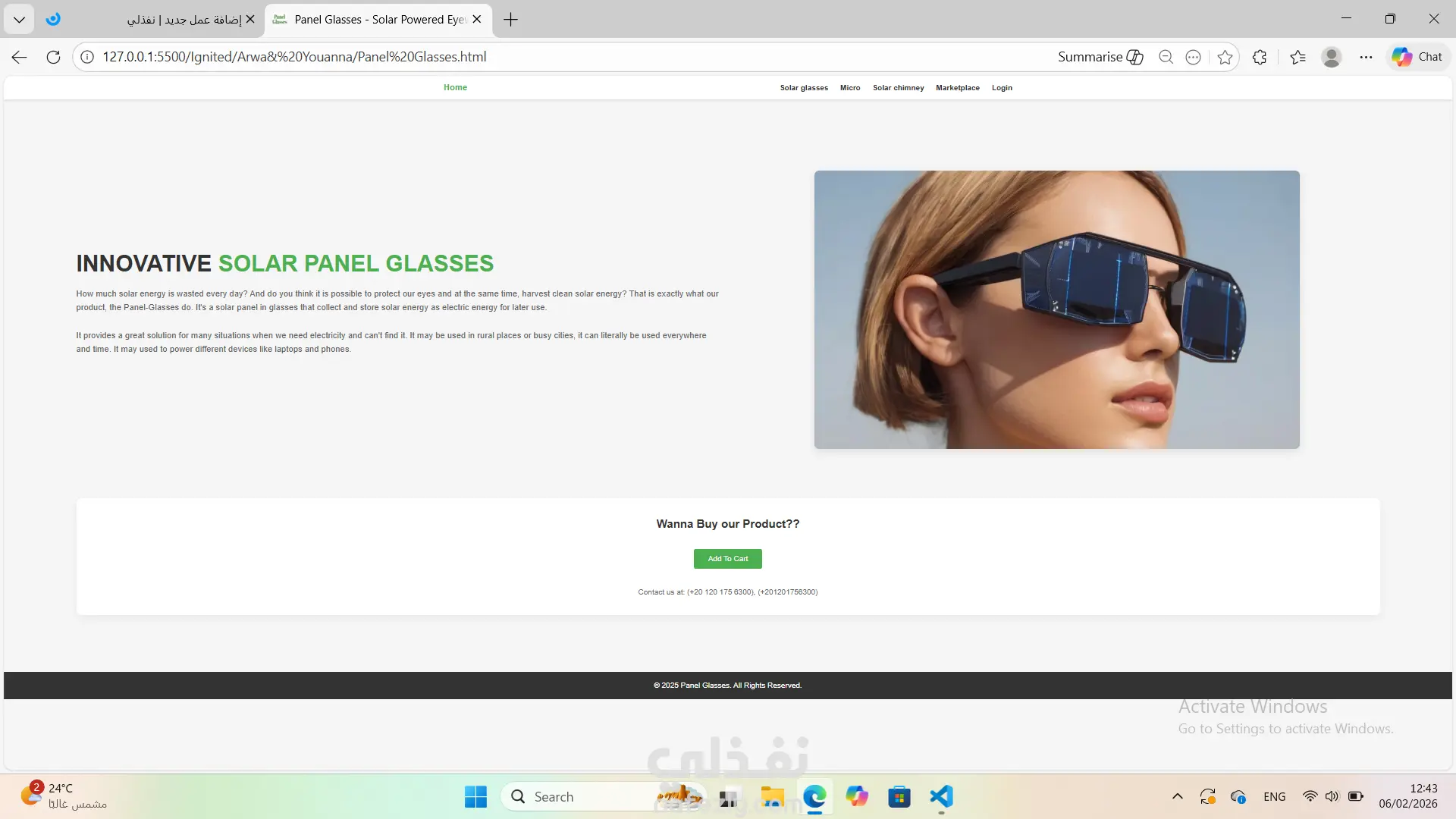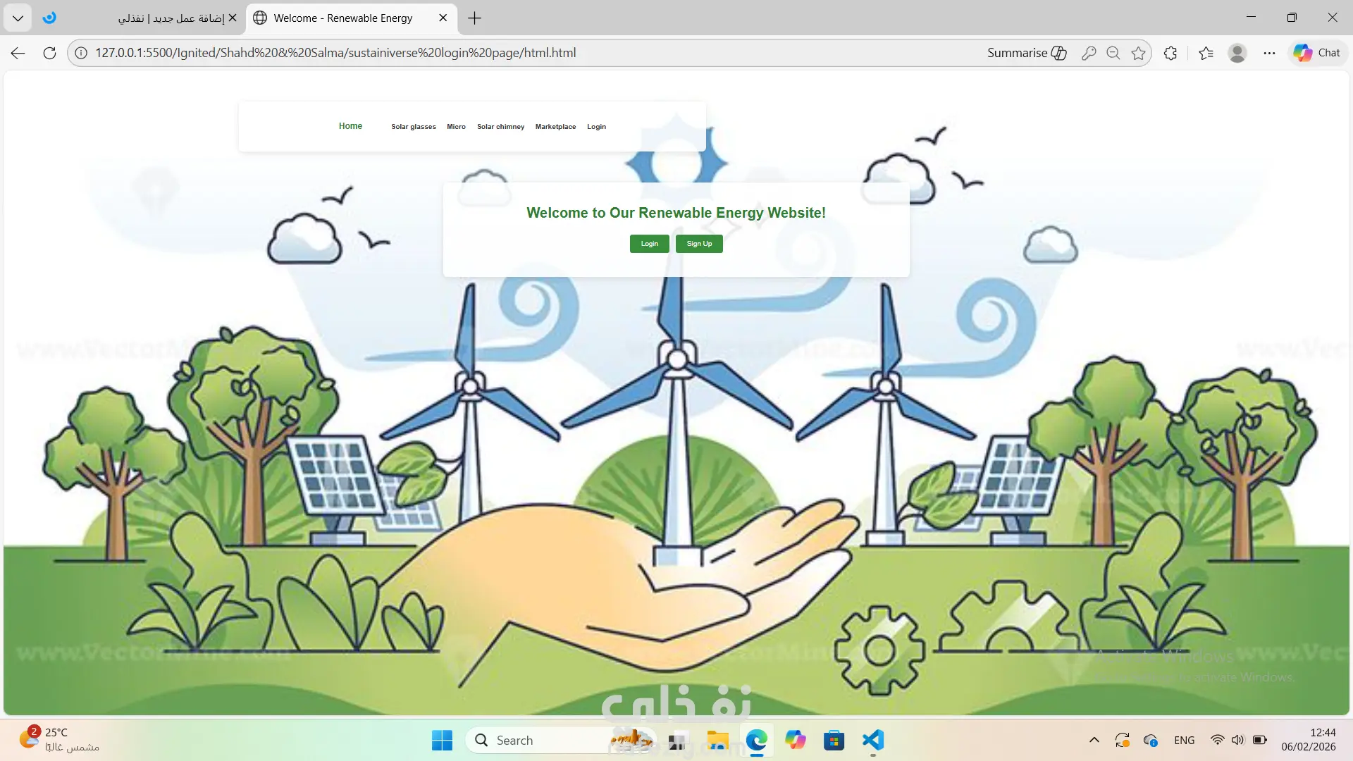 شريط التنقل (Navbar): يظهر بوضوح ويحتوي على الأقسام التالية: Home Solar glasses Micro (ربما يقصد بها Micro-grids أو تقنيات دقيقة) Solar chimney (المدخنة الشمسية) Marketplace (المتجر) Login